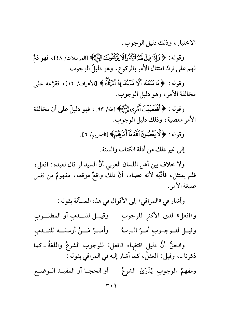 وقوله: {مَا مَنَعَكَ أَلَّا تَسْجُدَ إِذْ أَمَرْتُكَ} [الأعراف/ ١٢]، فقرَّعه على مخالفة الأمر، وهو دليل الوجوب.