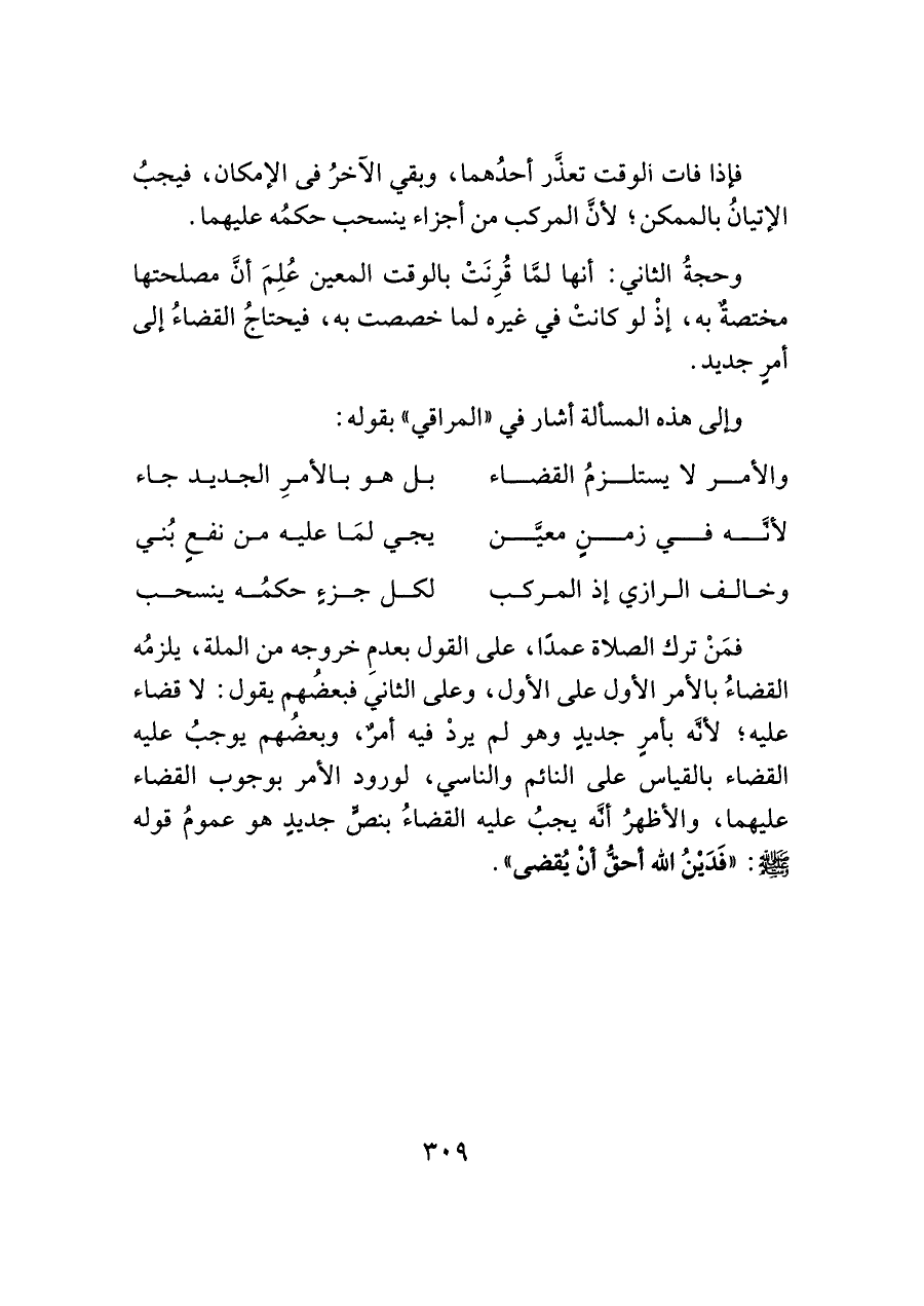 فمَنْ ترك الصَّلاة عمدًا، على القول بعدمِ خروجه من الملة، يلزمُه القضاءُ بالأمر الأوَّل على الأوَّل، وعلى الثَّاني فبعضُهم يقول: لا قضاء عليه، لأنَّه بأمرٍ جديدٍ وهو لم يردْ فيه أمرٌ، وبعضُهم يوجبُ عليه القضاء بالقياس على النائم والناسي، لورود الأمر بوجوب القضاء عليهما، والأظهرُ أنَّه يجبُ عليه القضاءُ بنصٍّ جديدٍ هو عمومُ قوله -صلى اللَّه عليه وسلم-: "فَدَيْنُ اللَّه أحقُّ أن يُقضى".