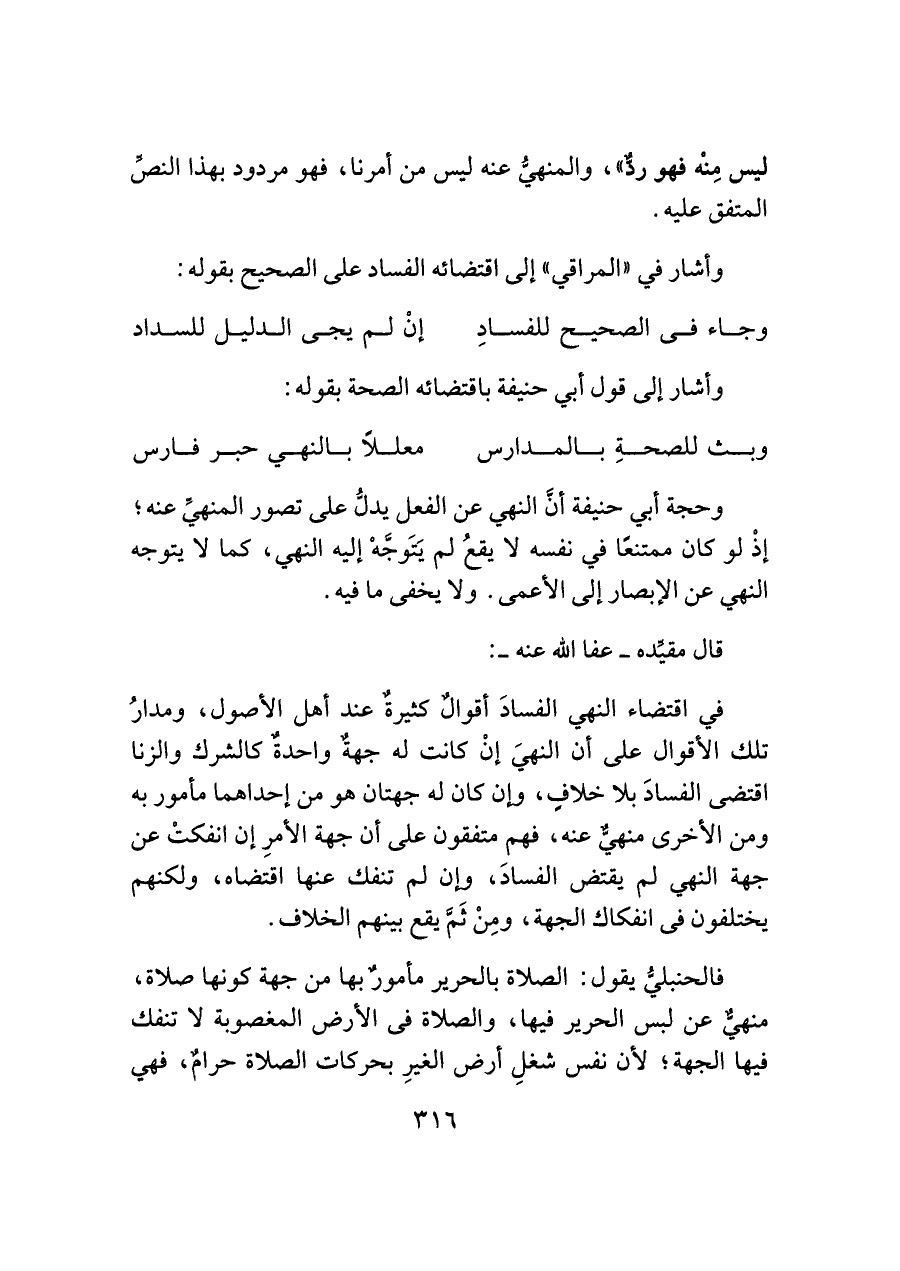 في اقتضاء النَّهي الفسادَ أقوالٌ كثيرةٌ عند أهل الأصول، ومدارُ تلك الأقوال على أن النهيَ إنْ كانت له جهة واحدةٌ كالشرك والزنا اقتضى الفسادَ بلا خلافٍ، وإن كان له جهتان هو من إحداهما مأمور به ومن الأخرى منهيٌّ عنه، فهم متفقون على أن جهة الأمرِ إن انفكتْ عن جهة النَّهي لم يقتض الفسادَ، وإن لم تنفك عنها اقتضاه، ولكنهم يختلفون في انفكاك الجهة، ومِنْ ثَمَّ يقع بينهم الخلاف.