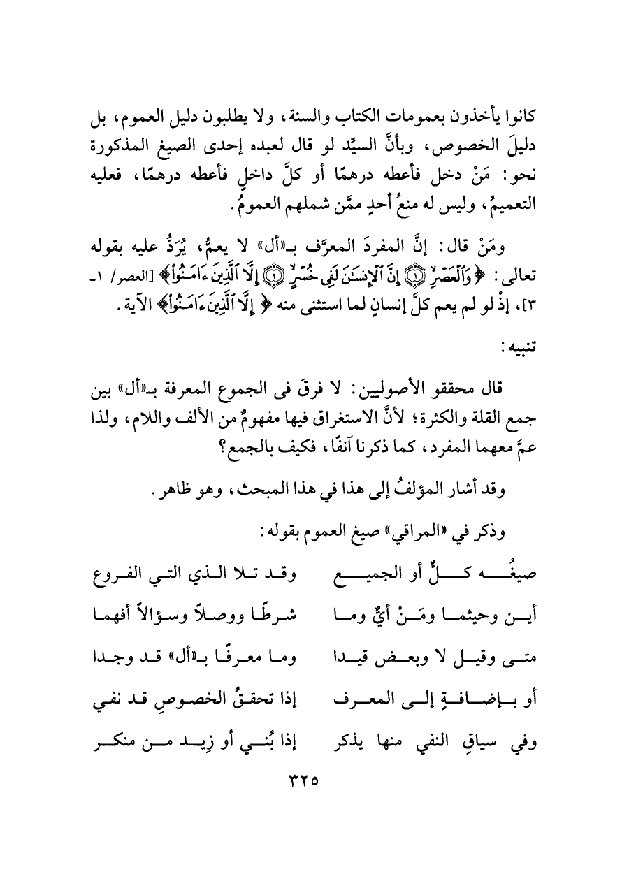 ومَنْ قال: إنَّ المفردَ المعرَّف بـ "أل" لا يعمُّ، يُرَدُّ عليه بقوله تعالى: {وَالْعَصْرِ (١) إِنَّ الْإِنْسَانَ لَفِي خُسْرٍ (٢) إِلَّا الَّذِينَ آمَنُوا} [العصر/ ١ - ٣]، إذْ لو لم يعم كلَّ إنسانِ لما استثنى منه {إِلَّا الَّذِينَ آمَنُوا} الآية.
