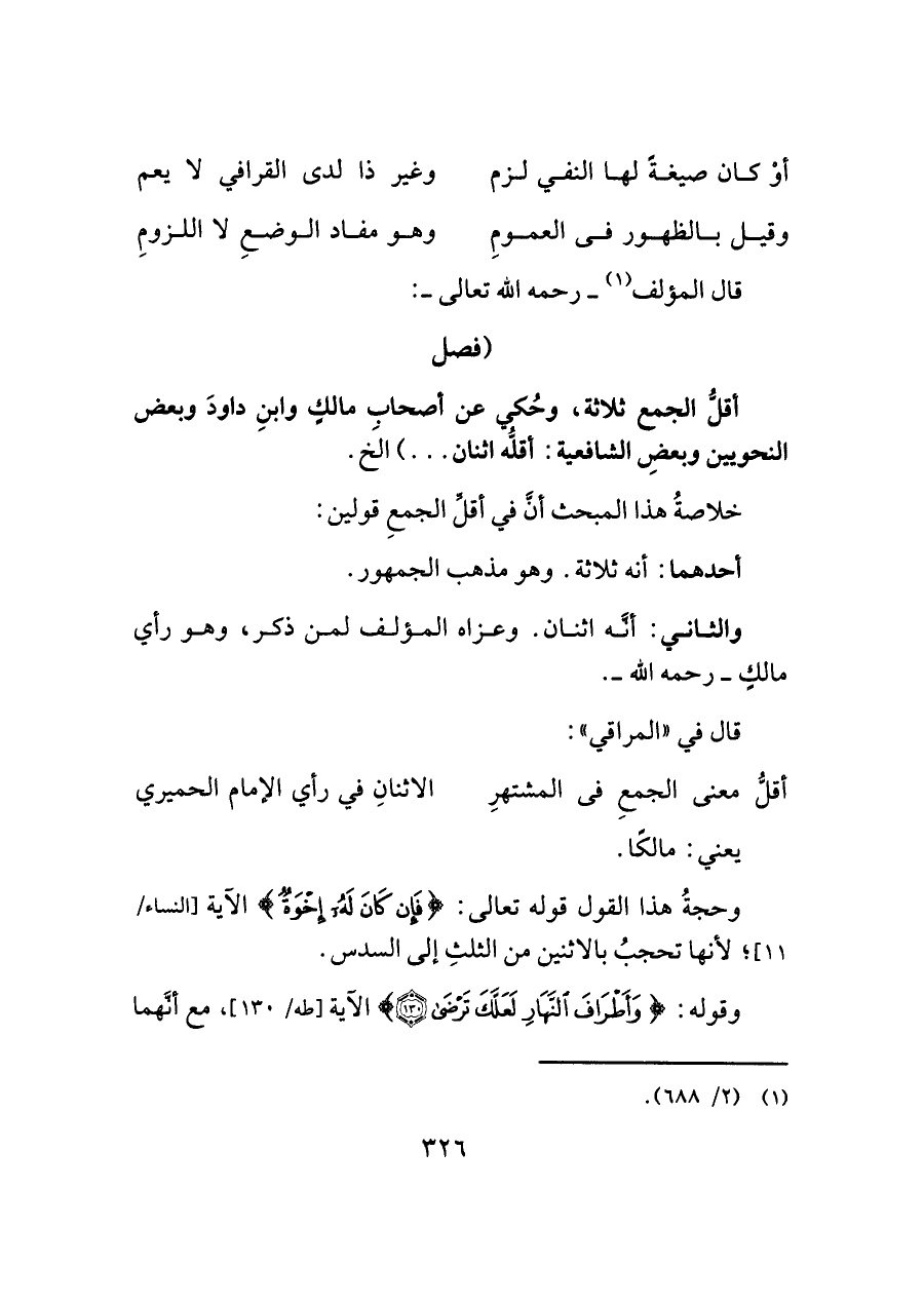أقلُّ الجمع ثلاثة، وحُكي من أصحاب مالكٍ وابنِ داودَ وبعض النَّحويين وبعضِ الشَّافعية: أقلُّه اثنان. . .) الَخ.