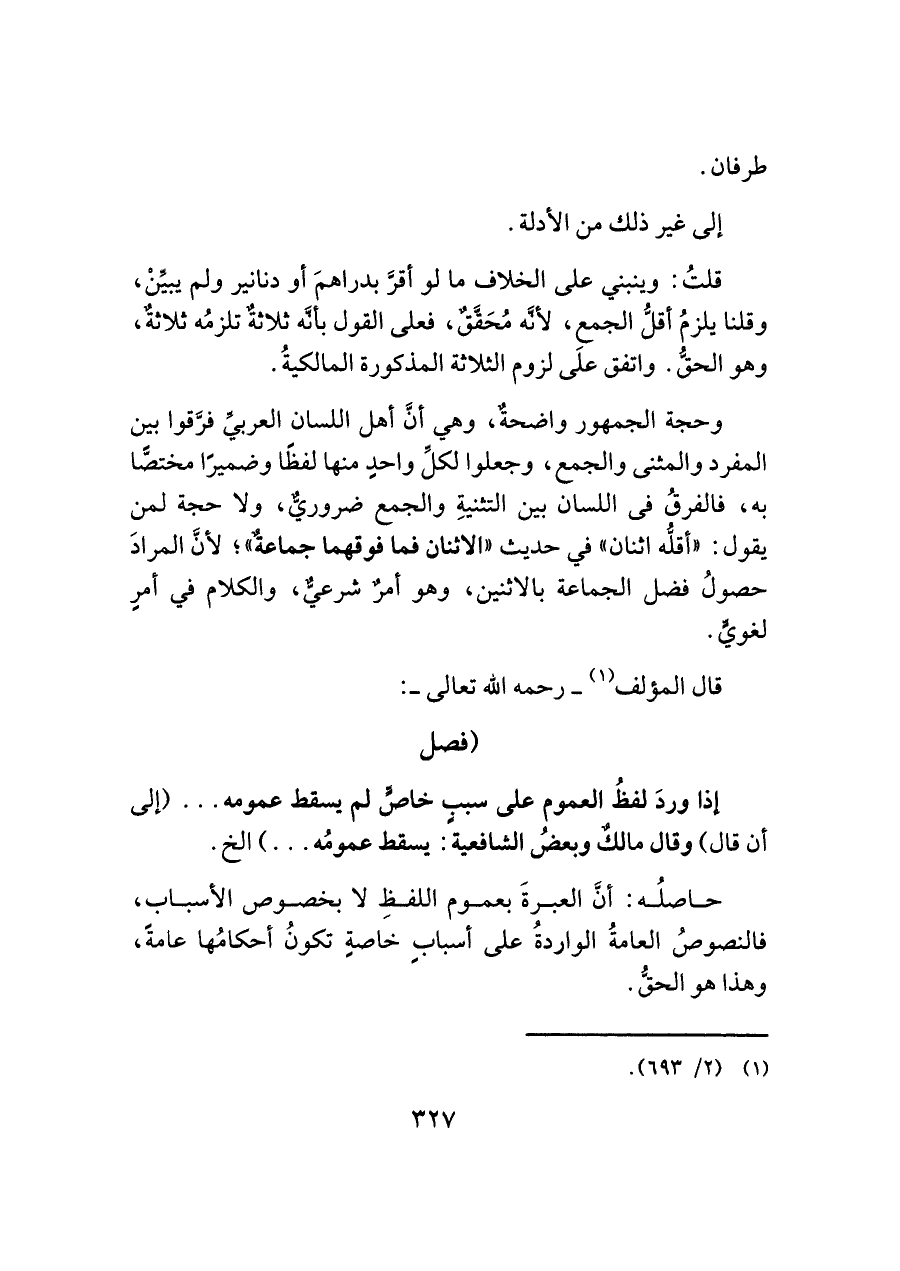 وحجة الجمهور واضحةٌ، وهي أنَّ أهل اللسان العربيِّ فرَّقوا بين المفرد والمثنى والجمع، وجعلوا لكلِّ واحدٍ منها لفظًا وضميرًا مختصًّا به، فالفرقُ في اللسان بين التثنيةِ والجمع ضروريٌّ، ولا حجة لمن يقول: "أقلُّه اثنان" في حديث "الاثنان فما فوقهما جماعةٌ"؛ لأنَّ المرادَ حصولُ فضل الجماعة بالاثنين، وهو أمرٌ شرعيٌّ، والكلام في أمرٍ لغويٍّ.