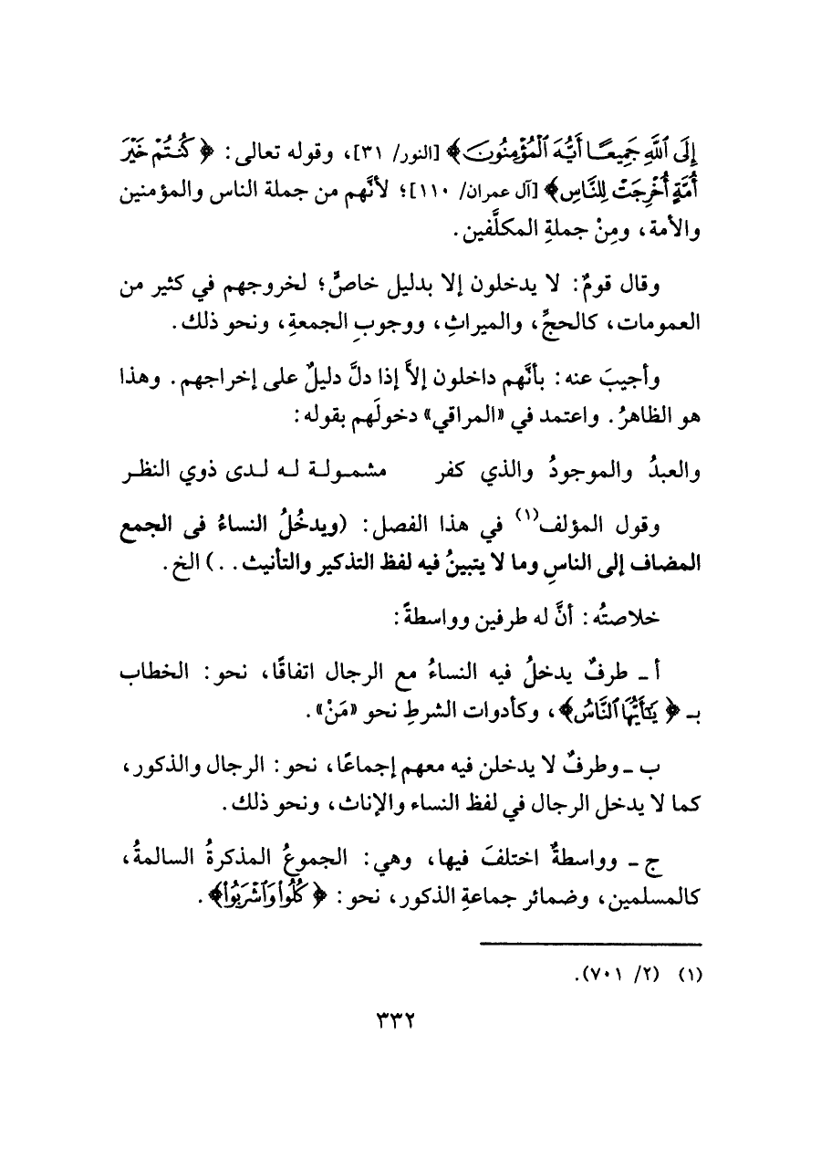 إِلَى اللَّهِ جَمِيعًا أَيُّهَ الْمُؤْمِنُونَ} [النور/ ٣١]، وقوله تعالى: {كُنْتُمْ خَيْرَ أُمَّةٍ أُخْرِجَتْ لِلنَّاسِ} [آل عمران/ ١١٠]؛ لأنهم من جملة النَّاس والمؤمنين والأمة، ومِنْ جملةِ المكلَّفين.