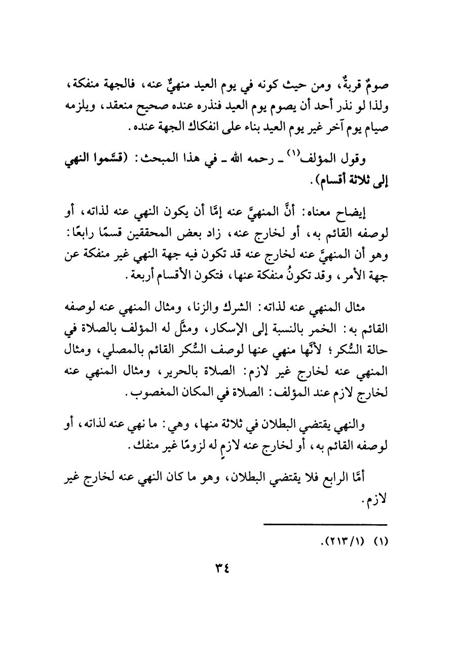 إيضاح معناه: أنَّ المنهيَّ عنه إمَّا أن يكون النهي عنه لذاته، أو لوصفه القائم به، أو لخارج عنه، زاد بعض المحققين قسمًا رابعًا: وهو أن المنهيَّ عنه لخارج عنه قد تكون فيه جهة النهي غير منفكة عن جهة الأمر، وقد تكونُ منفكة عنها، فتكون الأقسام أربعة.