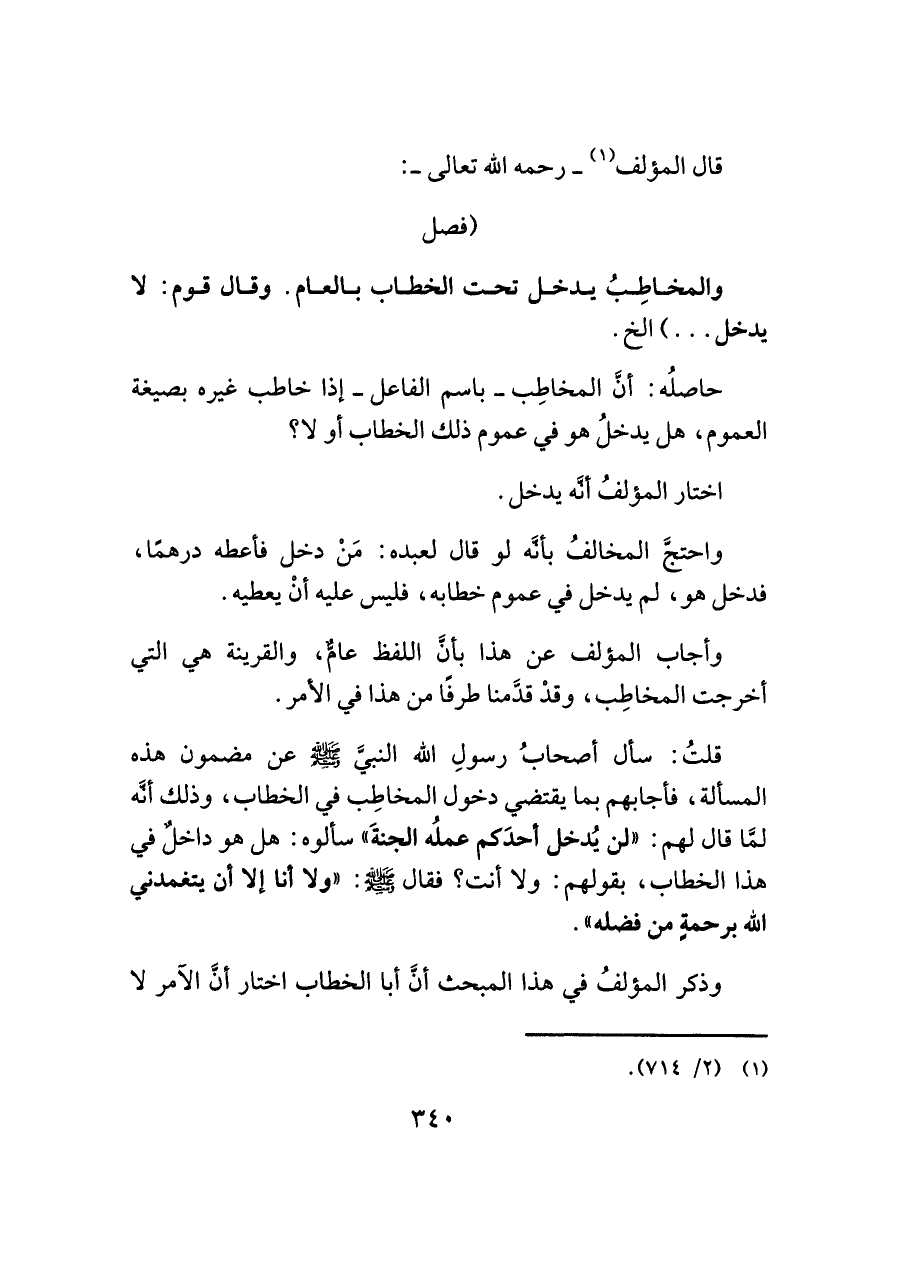 قلتُ: سأل أصحابُ رسولِ اللَّه النبيَّ -صلى اللَّه عليه وسلم- عن مضمون هذه المسألة، فأجابهم بما يقتضي دخول المخاطِب في الخطاب، وذلك أنَّه لمَّا قال لهم: "لن يُدخل أحدَكم عملُه الجنةَ" سألوه: هل هو داخل في هذا الخطاب، بقولهم: ولا أنت؟ فقال -صلى اللَّه عليه وسلم-: "ولا أنا إلَّا أن يتغمدني اللَّه برحمةٍ من فضله".