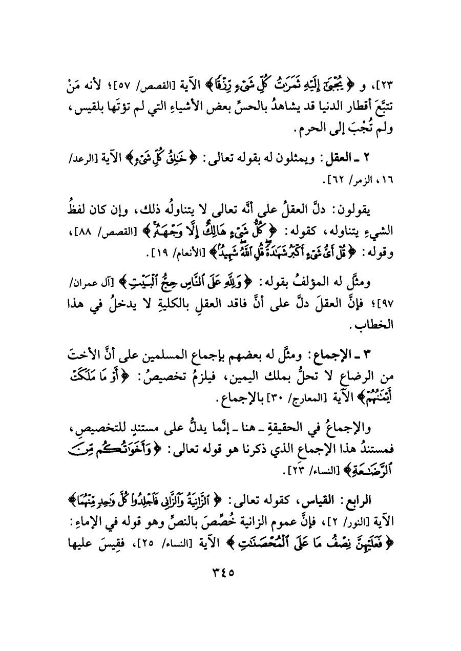 ٣ - الإجماع: ومثَّل له بعضهم بإجماع المسلمين على أنَّ الأختَ من الرضاع لا تحل بملك اليمين، فيلزمُ تخصيصُ: {أَوْ مَا مَلَكَتْ أَيْمَانُهُمْ} الآية [المعارج/ ٣٠] بالإجماع.