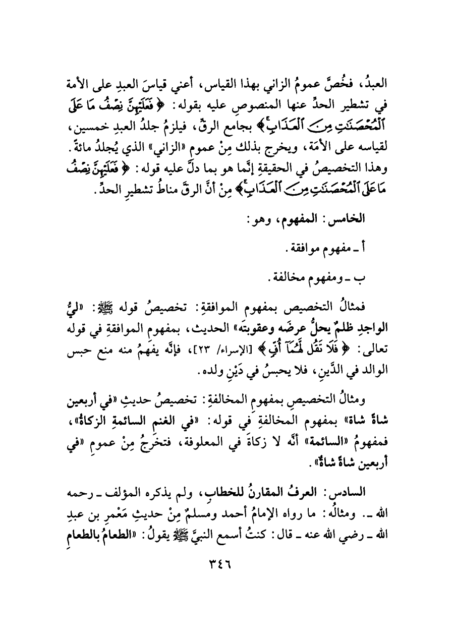 السادس: العرف المقارنُ للخطاب، ولم يذكره المؤلف -رحمه اللَّه-. ومثالُه: ما رواه الإمامُ أحمد ومَسلمٌ مِنْ حديثِ مَعْمرِ بن عبد اللَّه -رضي اللَّه عنه- قال: كنتُ أسمع النَّبيَّ -صلى اللَّه عليه وسلم- يقولُ: "الطعامُ بالطعامِ