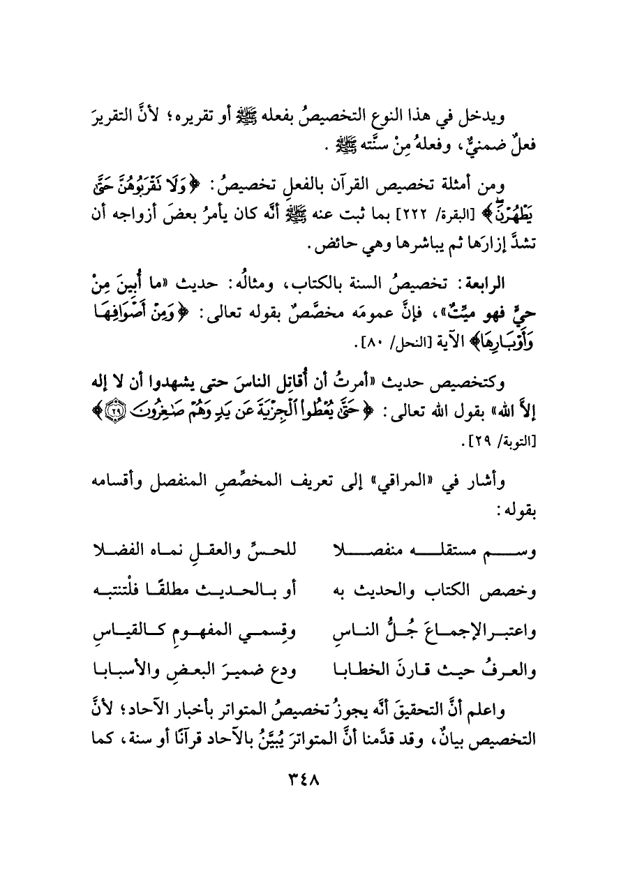 ومن أمثلة تخصيص القرآن بالفعلِ تخصيصُ: {وَلَا تَقْرَبُوهُنَّ حَتَّى يَطْهُرْنَ} [البقرة/ ٢٢٢] بما ثبت عنه -صلى اللَّه عليه وسلم- أنَّه كان يأمرُ بعضَ أزواجه أن تشدَّ إزارَها ثم يباشرها وهي حائض.