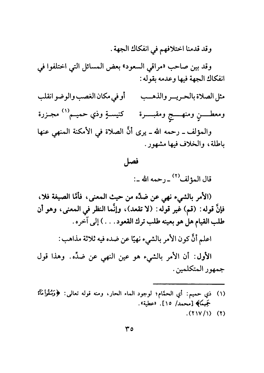(الأمر بالشيء نهي عن ضدِّه من حيث المعنى، فأمَّا الصيغة فلا، فإنَّ قوله: (قم) غير قوله: (لا تقعد)، وإنَّما النظر في المعنى، وهو أن طلب القيام هل هو بعينه طلب ترك القعود. . .) إلى آخره.