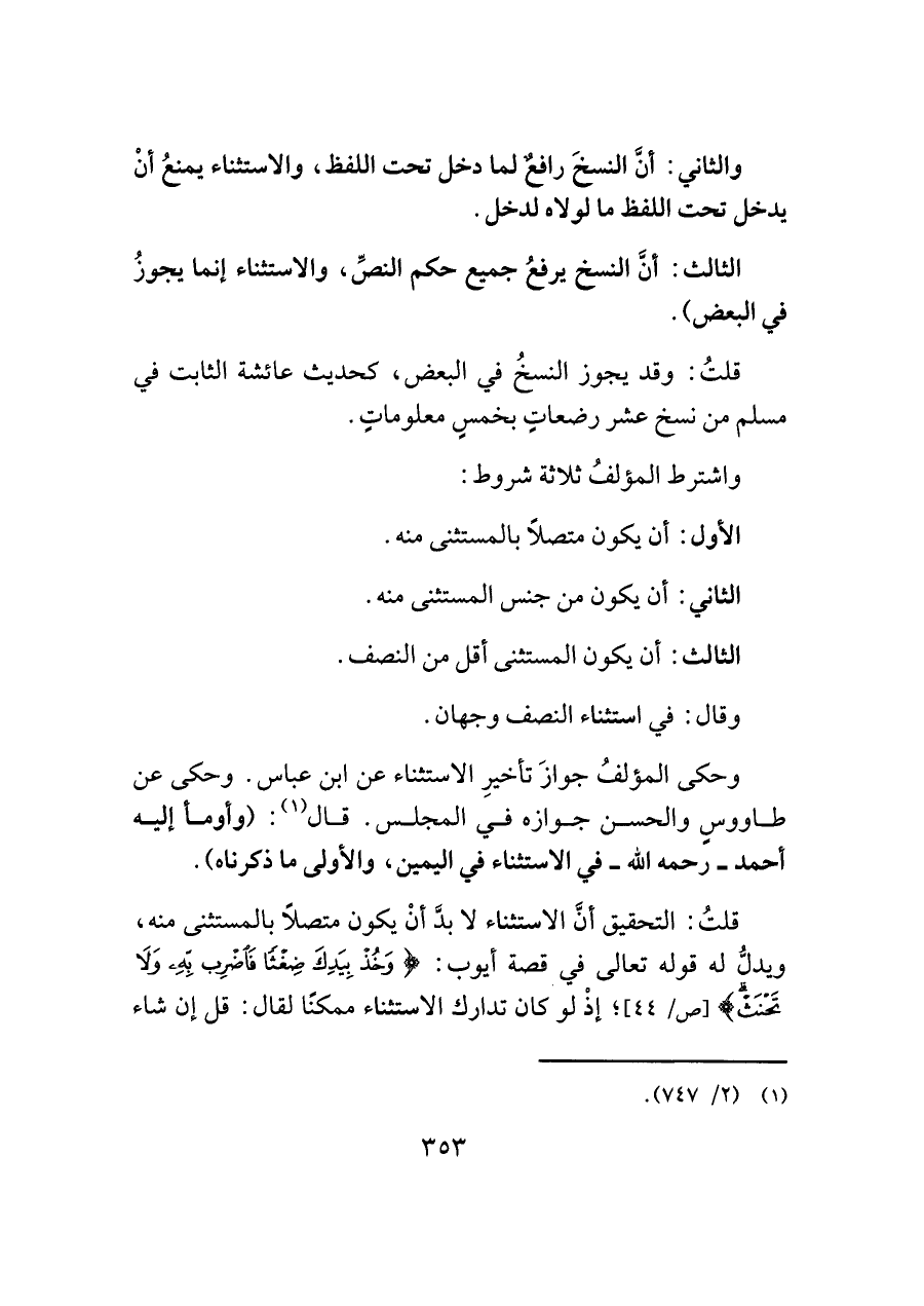 الثالث: أنَّ النسخ يرفعُ جميع حكم النصِّ، والاستثناء إنما يجوزُ في البعض).