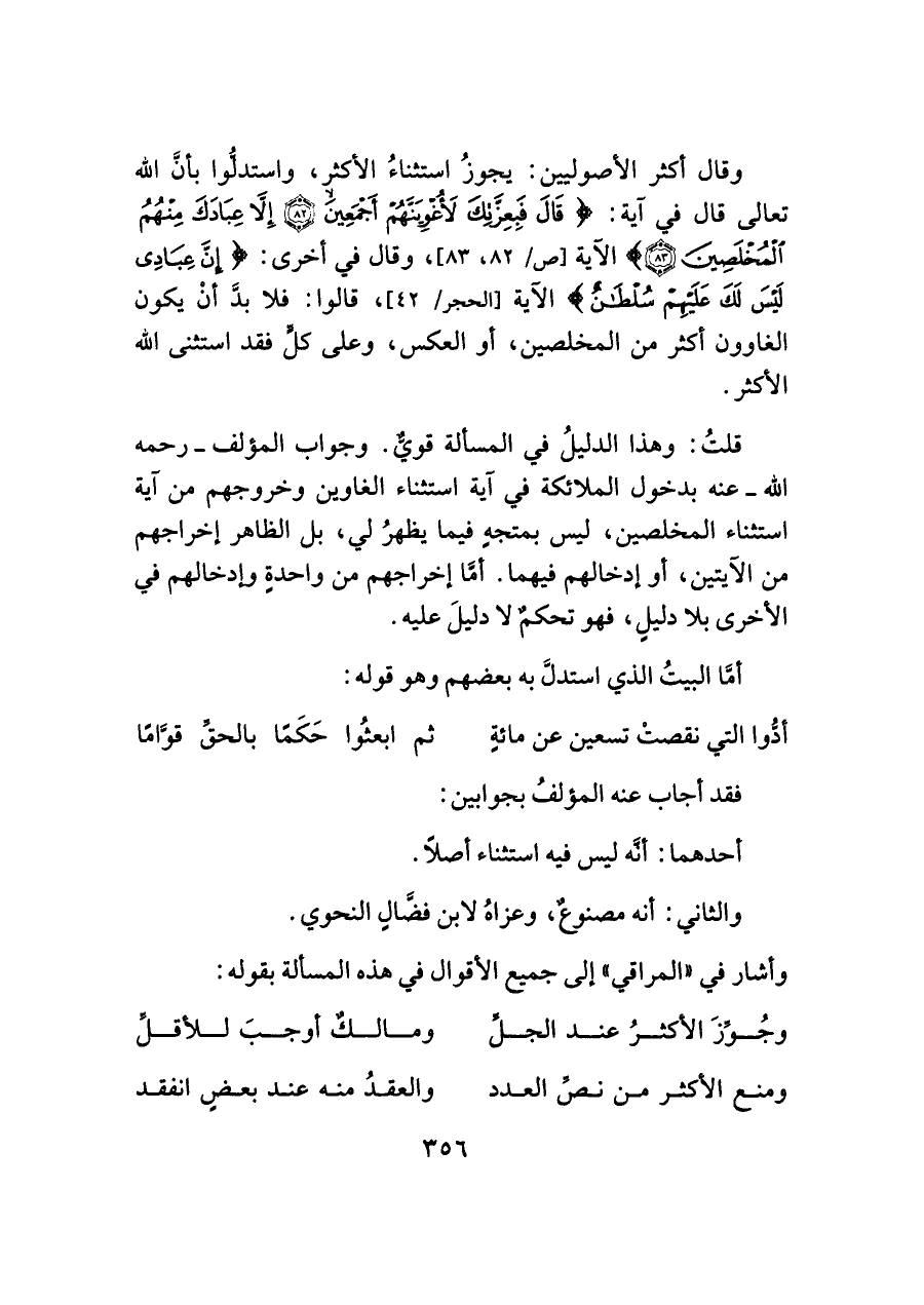 وقال أكثر الأصوليين: يجوزُ استثناءُ الأكثر، واستدلُّوا بأنَّ اللَّه تعالى قال في آية: {قَالَ فَبِعِزَّتِكَ لَأُغْوِيَنَّهُمْ أَجْمَعِينَ (٨٢) إِلَّا عِبَادَكَ مِنْهُمُ الْمُخْلَصِينَ (٨٣)} [الآية ص/ ٨٢، ٨٣]، وقال في أخرى: {إِنَّ عِبَادِي لَيْسَ لَكَ عَلَيْهِمْ سُلْطَانٌ} الآية [الحجر/ ٤٢]، قالوا: فلا بدَّ أنْ يكون الغاوون أكثر من المخلصين، أو العكس، وعلى كلٍّ فقد استثنى اللَّه الأكثر.