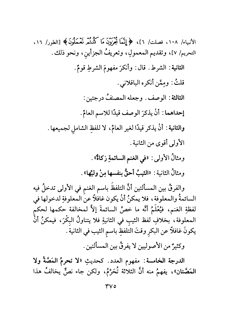 الدرجة الخامسة: مفهوم العدد. كحديثِ "لا تحرمُ المَصَّةُ ولا المَصَّتان"، يفهمُ منه أنَّ الثلاثةُ تُحَرِّمُ، ولكن جاء نصٌّ يخالفُ هذا