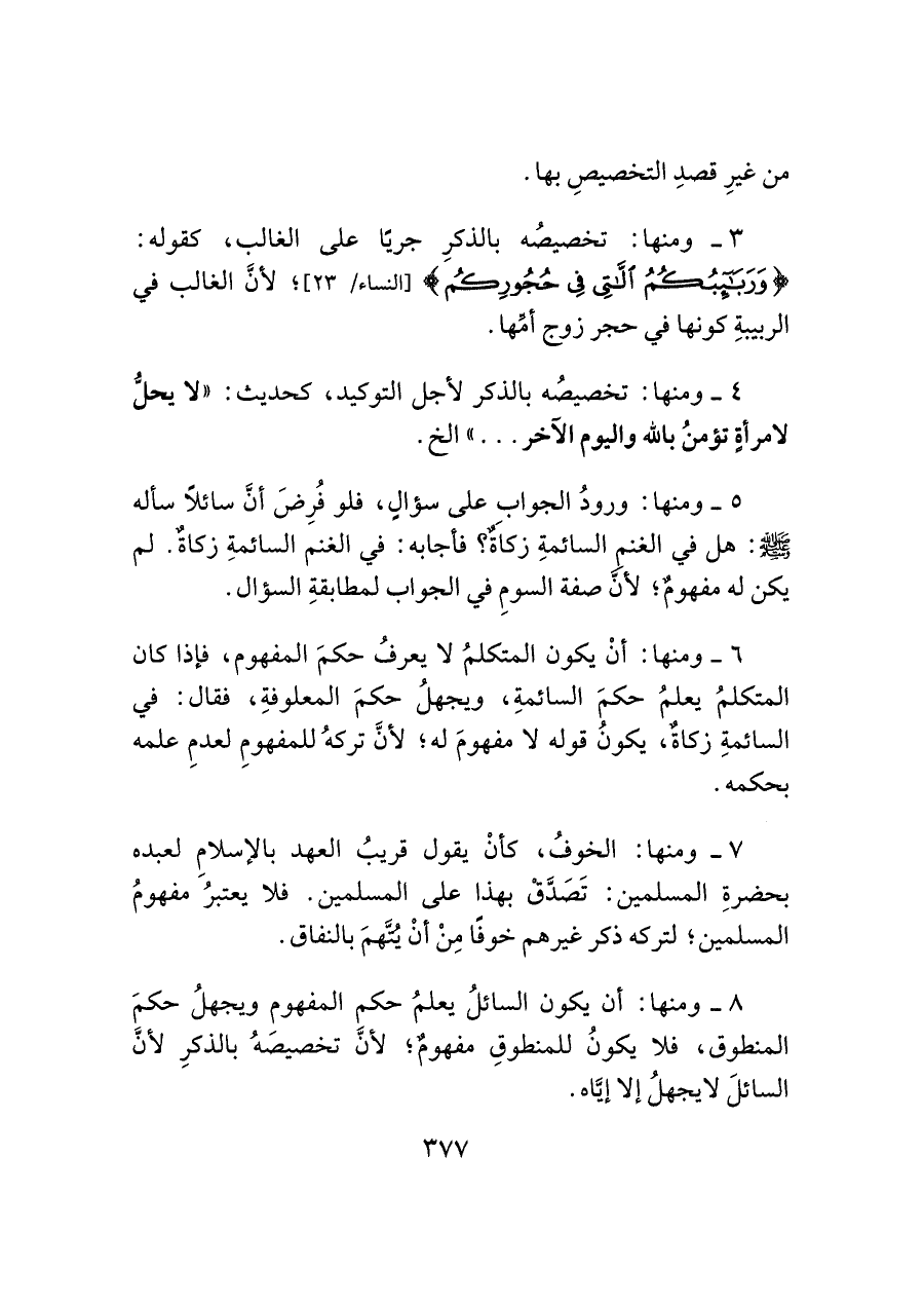 ٥ - ومنها: ورودُ الجواب على سؤالٍ، فلو فُرِضَ أنَّ سائلًا سأله -صلى اللَّه عليه وسلم-: هل في الغنمِ السائمةِ زكاَةٌ؟ فأجابه: في الغنم السائمةِ زكاةٌ. لم يكن له مفهومٌ؛ لأنَّ صفة السومِ في الجواب لمطابقةِ السؤال.