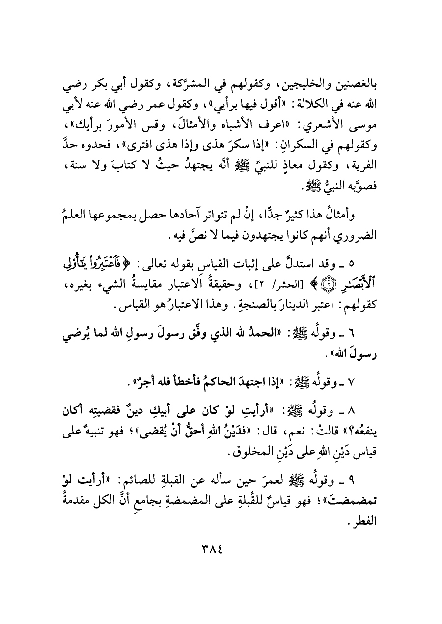 ٥ - وقد استدلَّ على إثبات القياسِ بقوله تعالى: {فَاعْتَبِرُوا يَاأُولِي الْأَبْصَارِ (٢)} [الحشر/ ٢]، وحقيقةُ الاعتبار مقايسةُ الشيء بغيره، كقولهم: اعتبر الدينارَ بالصنجةِ. وهذا الاعتبارُ هو القياس.