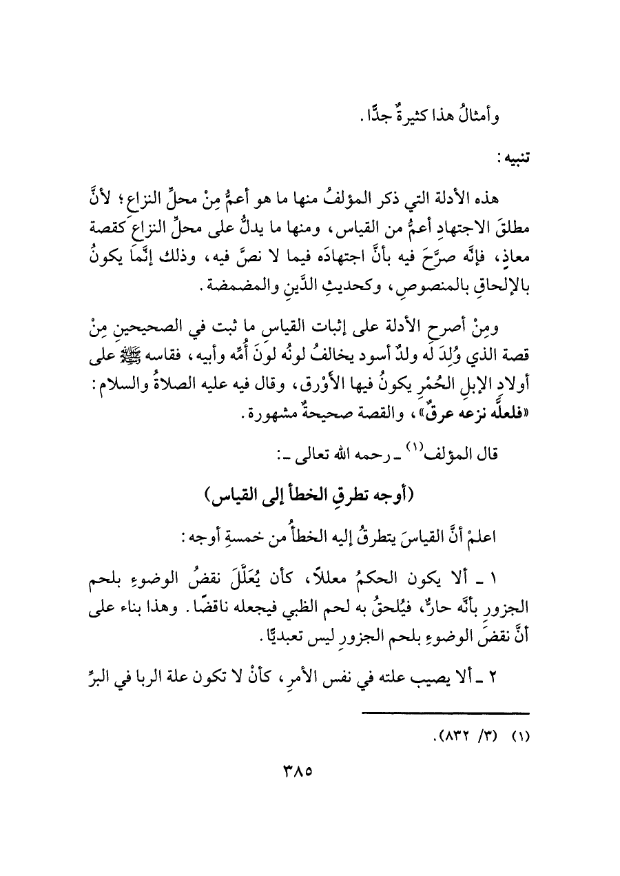 ومِنْ أصرحِ الأدلة على إثبات القياسِ ما ثبت في الصحيحينِ مِنْ قصة الذي وُلِدَ له ولدٌ أسود يخالفُ لونُه لونَ أُمِّه وأبيه، فقاسه -صلى اللَّه عليه وسلم- على أولادِ الإبلِ الحُمْرِ يكونُ فيها الأَوْرق، وقال فيه عليه الصلاةُ والسلام: "فلعلَّه نزعه عرقٌ"، والقصة صحيحةٌ مشهورة.