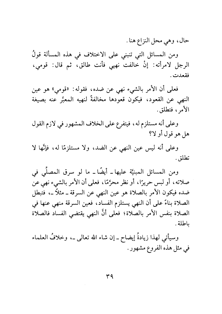 ومن المسائل المبنيَّة عليها -أيضًا- ما لو سرق المصلِّي في صلاته، أو لبس حريرًا، أو نظر محرَّمًا، فعلى أن الأمر بالشيء نهي عن ضده فيكون الأمر بالصلاة هو عين النهي عن السرقة -مثلًا-، فتبطل الصلاة بناءً على أن النهي يستلزم الفساد، فعين السرقة منهي عنها في الصلاة بنفس الأمر بالصلاة؛ فعلى أنَّ النهي يقتضي الفساد فالصلاة باطلة.