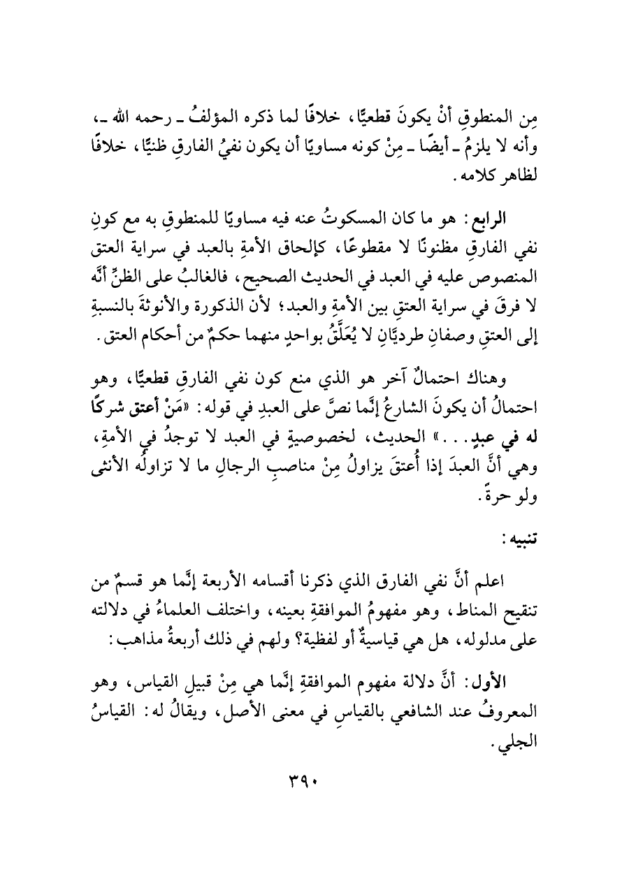 مِن المنطوقِ أنْ يكونَ قطعيًّا، خلافًا لما ذكره المؤلفُ -رحمه اللَّه-، وأنه لا يلزمُ -أيضًا- مِنْ كونه مساويًا أن يكون نفيُ الفارقِ ظنيًّا، خلافًا لظاهر كلامه.