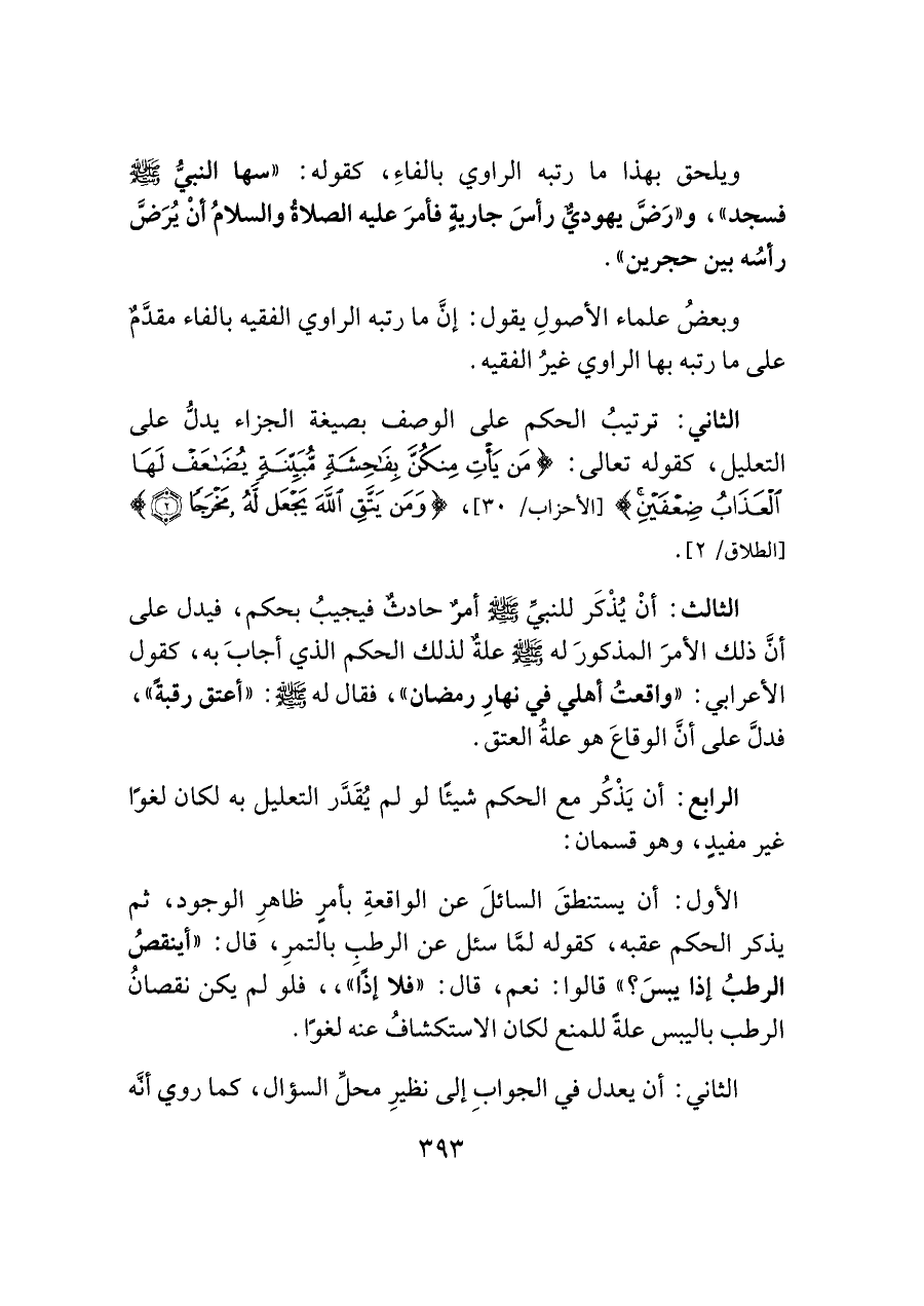 الثالث: أنْ يُذْكَر للنبيِّ -صلى اللَّه عليه وسلم- أمرٌ حادثٌ فيجيبُ بحكم، فيدل على أنَّ ذلك الأمرَ المذكورَ له -صلى اللَّه عليه وسلم- علةٌ لذلك الحكم الذي أجابَ به، كقول الأعرابي: "واقعتُ أهلي في نهارِ رمضان"، فقال له -صلى اللَّه عليه وسلم-: "أعتق رقبةً"، فدلَّ على أنَّ الوقاعَ هو علةُ العتق.