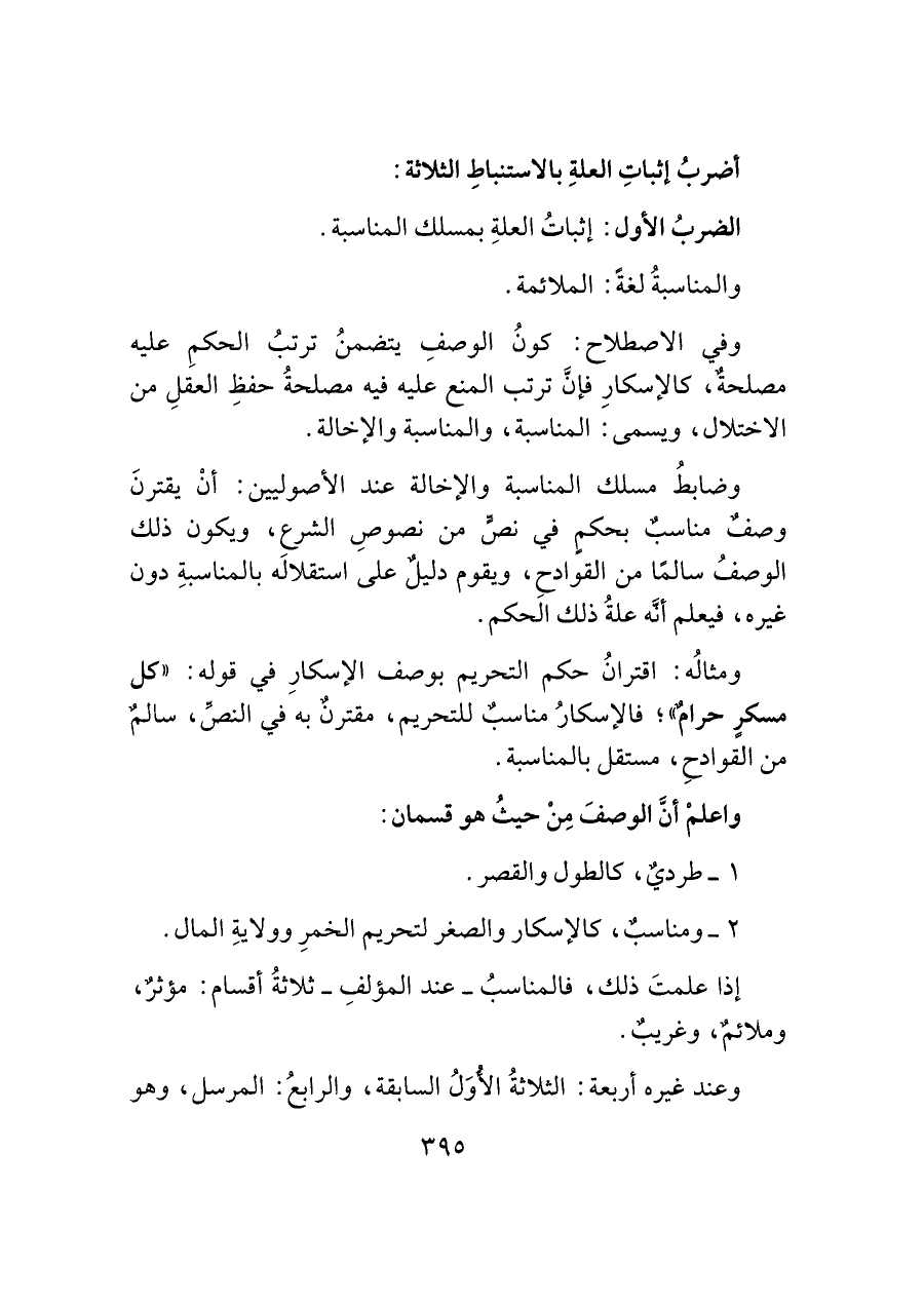 إذا علمتَ ذلك، فالمناسبُ -عند المؤلفِ- ثلاثةُ أقسام: مؤثرٌ، وملائمٌ، وغريبٌ.