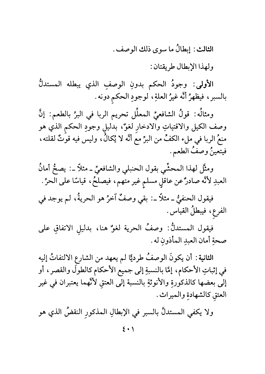 الثانية: أن يكونَ الوصفُ طرديًّا لم يعهد من الشارع الالتفاتُ إليه في إثباتِ الأحكام، إمَّا بالنسبةِ إلى جميع الأحكام كالطولَ والقصر، أو إلى بعضها كالذكورةِ والأنوثةِ بالنسبة إلى العتقِ لأنَّهما يعتبران في غير العتقِ كالشهادةِ والميراث.