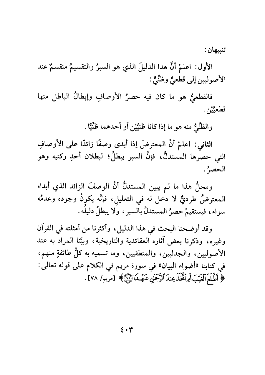 وقد أوضحنا البحث في هذا الدليل، وأكثرنا من أمثلته في القرآن وغيره، وذكرنا بعض آثاره العقائدية والتاريخية، وبيَّنا المراد به عند الأصوليين، والجدليين، والمنطقيين، وما تسميه به كلُّ طائفةٍ منهم، في كتابنا "أضواء البيان" في سورة مريم في الكلام على قوله تعالى: {أَطَّلَعَ الْغَيْبَ أَمِ اتَّخَذَ عِنْدَ الرَّحْمَنِ عَهْدًا (٧٨)} [مريم/ ٧٨].