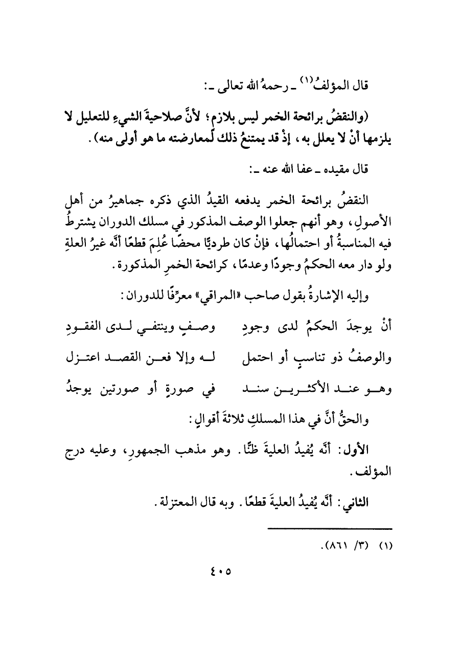 (والنقضُ برائحة الخمر ليس بلازمٍ؛ لأنَّ صلاحيةَ الشيءِ للتعليل لا يلزمها أنْ لا يعلل به، إذْ قد يمتنعُ ذلك لمعارضته ما هو أولى منه).