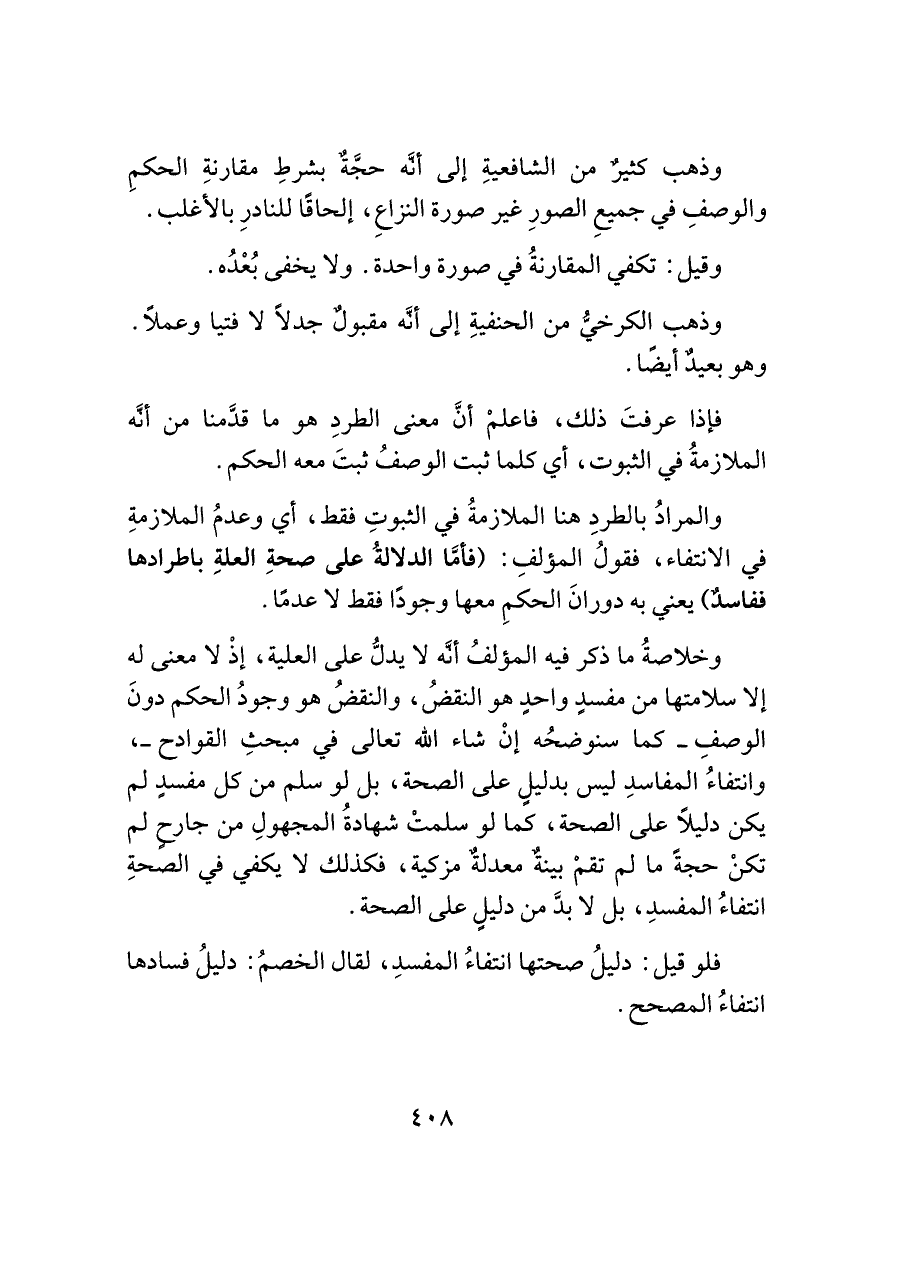 وذهب كثيرٌ من الشافعيةِ إلى أنَّه حجَّةٌ بشرطِ مقارنةِ الحكمِ والوصفِ في جميعِ الصورِ غير صورة النزاعِ، إلحاقًا للنادرِ بالأغلب.