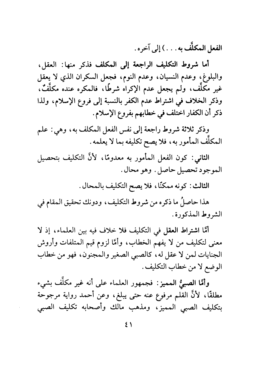 أما شروط التكليف الراجعة إلى المكلف فذكر منها: العقل، والبلوغ، وعدم النسيان، وعدم النوم، فجعل السكران الذي لا يعقل غير مكلَّف، ولم يجعل عدم الإكراه شرطًا، فالمكره عنده مكلَّفٌ، وذكر الخلاف في اشتراط عدم الكفر بالنسبة إلى فروع الإسلام، ولذا ذكر أن الكفار اختلف في خطابهم بفروع الإسلام.