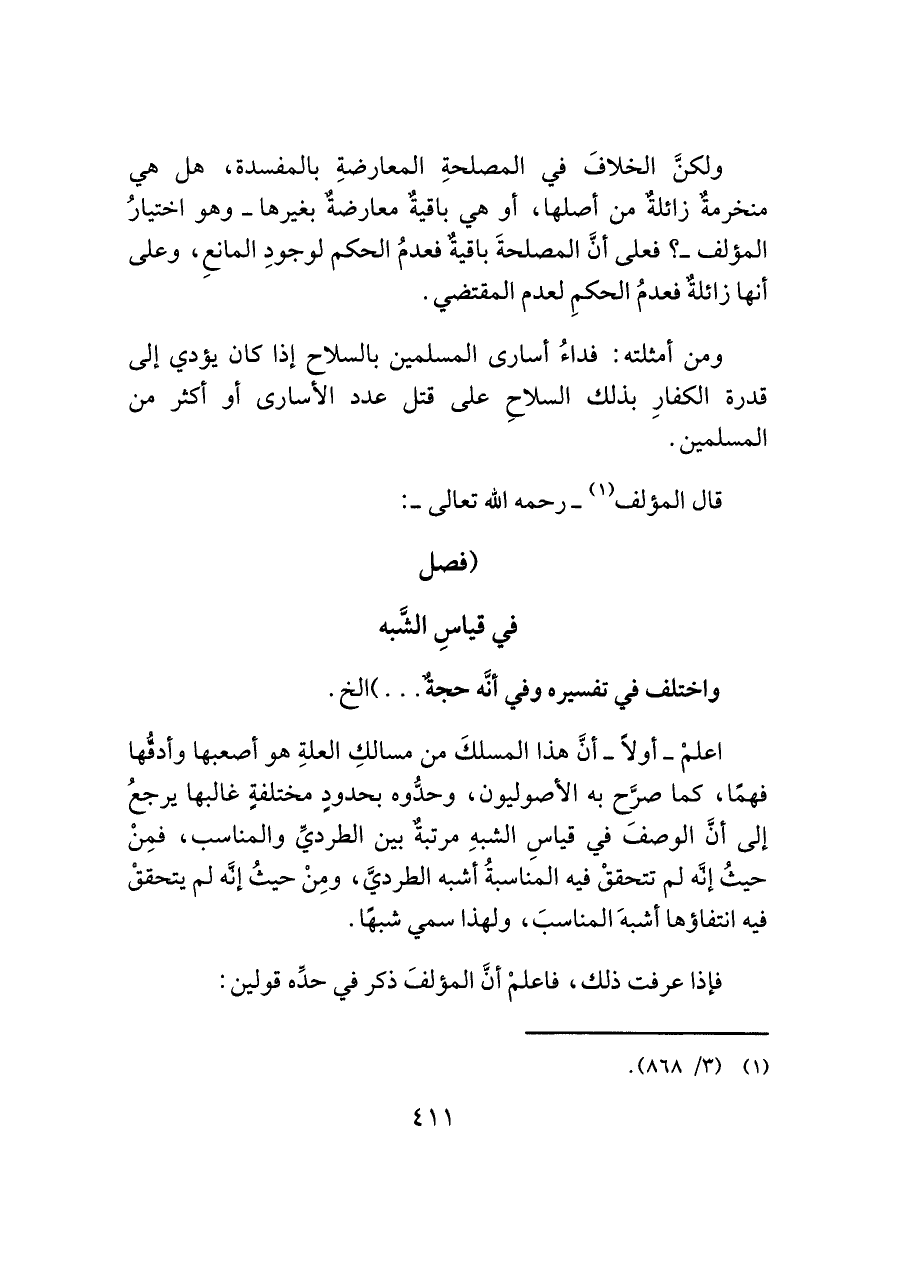 ولكن الخلافَ في المصلحةِ المعارضةِ بالمفسدة، هل هي منخرمةٌ زائلةٌ من أصلها، أو هي باقية معارضة بغيرها -وهو اختيارُ المؤلف-؟ فعلى أنَّ المصلحةَ باقيةٌ فعدمُ الحكم لوجودِ المانعِ، وعلى أنها زائلةٌ فعدمُ الحكمِ لعدم المقتضي.