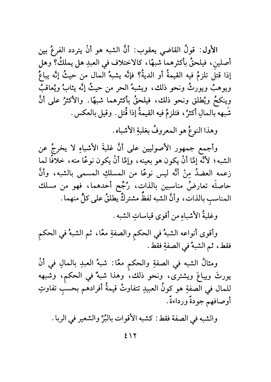 الأول: قولُ القاضي يعقوب: أنَّ الشبه هو أنْ يتردد الفرعُ بين أصلينِ، فيلحقُ بأكثرهما شبهًا، كالاختلاف في العبدِ هل يملكُ؟ وهل إذا قتل تلزمُ فيه القيمةُ أو الديةُ؟ فإنَّه يشبهُ المال من حيثُ إنَّه يباعُ ويوهبُ ويورثُ ونحو ذلك، ويشبهُ الحر من حيثُ إنَّه يثابُ ويُعاقبُ وينكحُ ويُطلق ونحو ذلك، فيلحقُ بأكثرهما شبهًا. والأكثرُ على أنَّ شَبهه بالمالِ أكثرُ، فتلزمُ فيه القيمةُ إذا قُتل. وقيل بالعكس.