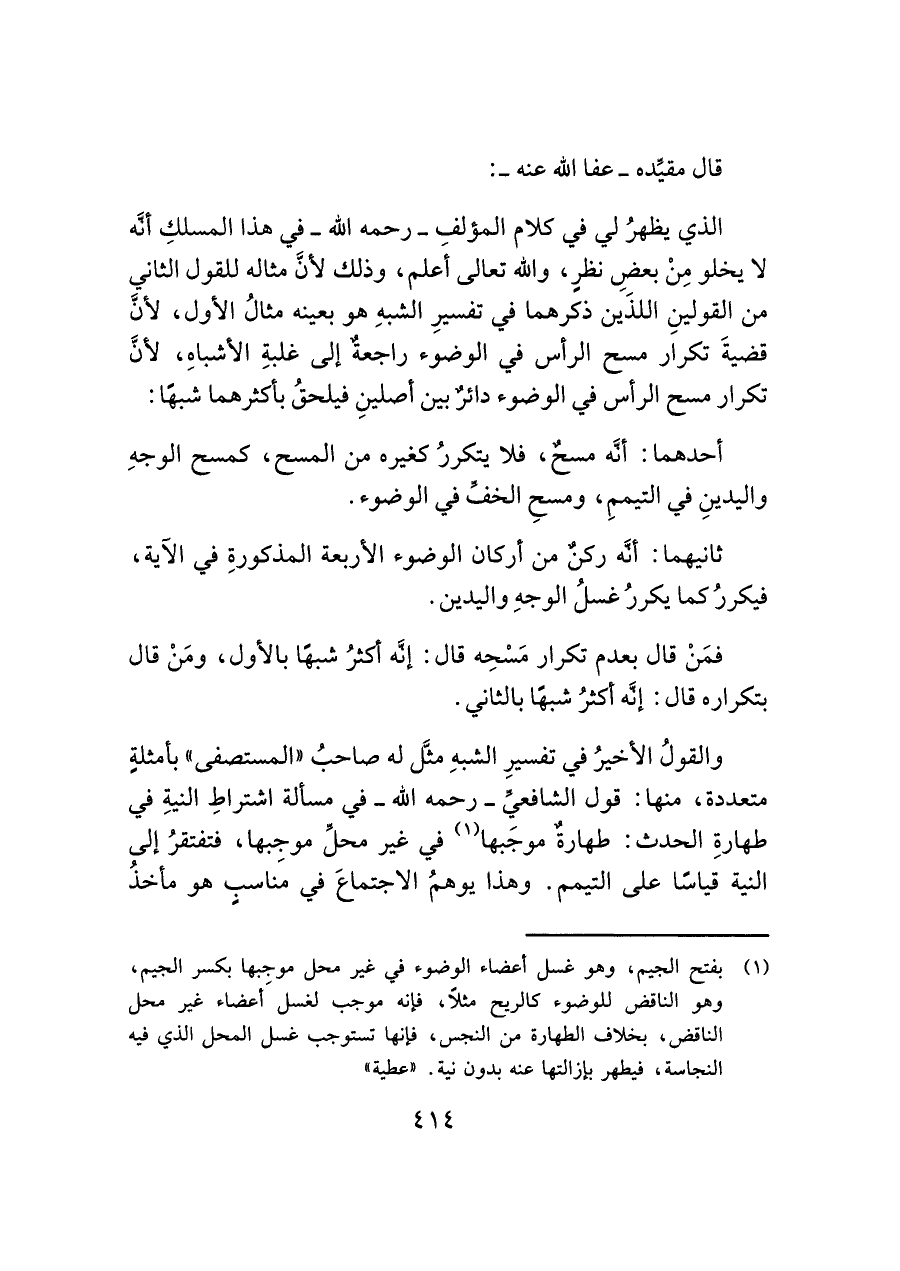 الذي يظهرُ لي في كلام المؤلفِ -رحمه اللَّه- في هذا المسلكِ أنَّه لا يخلو مِنْ بعضِ نظرٍ، واللَّه تعالى أعلم، وذلك لأنَّ مثاله للقول الثاني من القولينِ اللذَين ذكرهما في تفسيرِ الشبهِ هو بعينه مثالُ الأول، لأنَّ قضيةَ تكرار مسح الرأس في الوضوء راجعةٌ إلى غلبةِ الأشباهِ، لأنَّ تكرار مسح الرأس في الوضوء دائرٌ بين أصلينِ فيلحقُ بأكثرهما شبهًا: