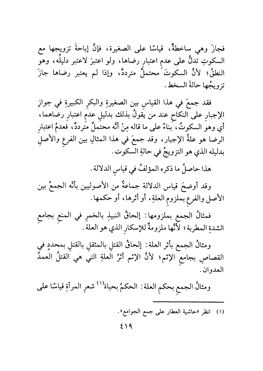 فقد جمعَ في هذا القياسِ بين الصغيرةِ والبكرِ الكبيرةِ في جوازِ الإجبارِ على النكاحِ عند من يقولُ بذلك بدليلِ عدمِ اعتبارِ رضاهما، أي وهو السكوتُ، بناءً على ما قاله مِنْ أنَّه محتملٌ مترددٌ، فعدمُ اعتبارِ الرضا هو علةُ الإجبار، وقد جمعَ في هذا المثالِ بين الفرعِ والأصلِ بدليله الذي هو التزويجُ في حالةِ السكوت.