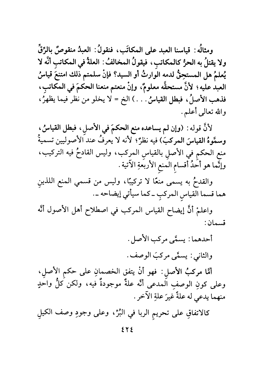 ومثالُه: قياسنا العبد على المكاتَب، فنقولُ: العبدُ منقوصٌ بالرِّقِّ ولا يقتلُ به الحرُّ كالمكاتب، فيقولُ المخالفُ: العلةُ في المكاتب أنَّه لا يُعلمُ هل المستحِقُّ لدمه الوَارثُ أو السيد؟ فإنْ سلمتم ذلك امتنع قياسُ العبد عليه؛ لأنَّ مستحقَّه معلومٌ، وإنْ منعتم منعنا الحكمَ في المكاتبِ، فذهب الأصلُ، فبطل القياسُ. . .) الخ = لا يخلو من نظر فيما يظهرُ، واللَّه تعالى أعلم.