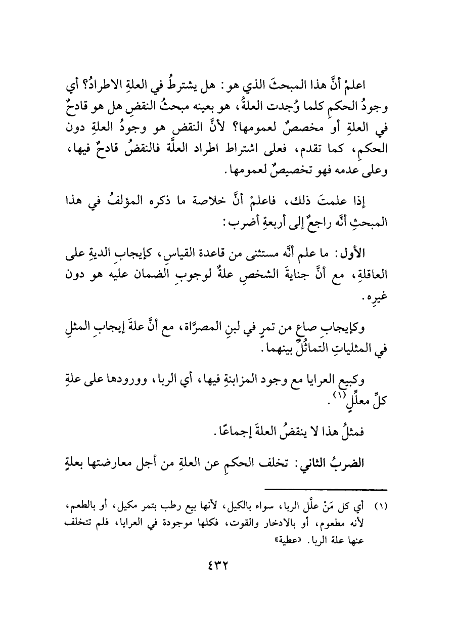 اعلمْ أنَّ هذا المبحثَ الذي هو: هل يشترطُ في العلةِ الاطرادُ؟ أي وجودُ الحكمِ كلما وُجدت العلةُ، هو بعينه مبحثُ النقضِ هل هو قادحٌ في العلةِ أو مخصصٌ لعمومها؟ لأنَّ النقض هو وجودُ العلةِ دون الحكمِ، كما تقدم، فعلى اشتراط اطراد العلَّة فالنقضُ قادحٌ فيها، وعلى عدمه فهو تخصيصٌ لعمومها.