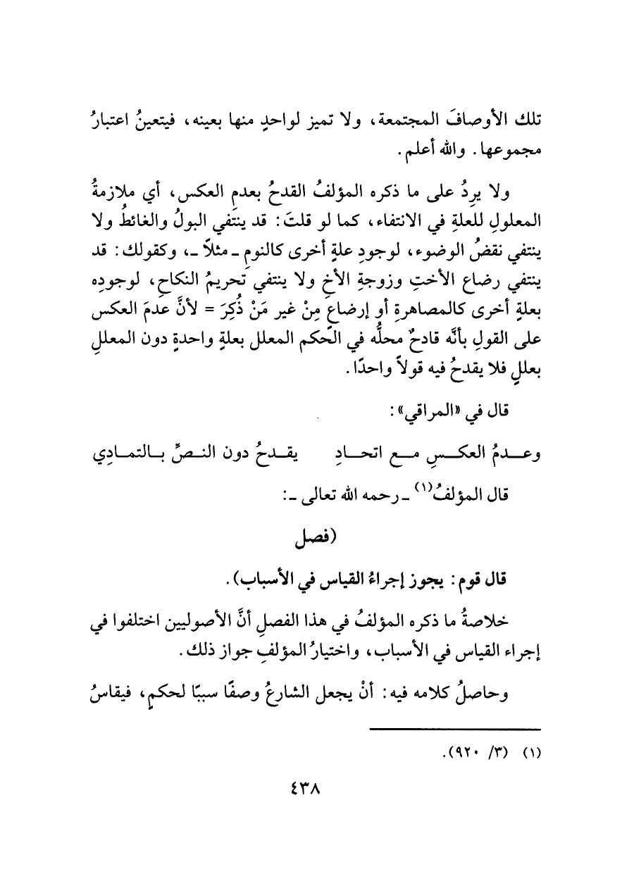 ولا يرِدُ على ما ذكره المؤلفُ القدحُ بعدمِ العكس، أي ملازمةُ المعلولِ للعلةِ في الانتفاء، كما لو قلتَ: قد ينتفي البولُ والغائطُ ولا ينتفي نقضُ الوضوء، لوجودِ علةٍ أخرى كالنومِ -مثلًا-، وكقولك: قد ينتفي رضاع الأختِ وزوجةِ الأخِ ولا ينتفي تحريمُ النكاحِ، لوجودِه بعلةٍ أخرى كالمصاهرةِ أو إرضاع مِنْ غير مَنْ ذُكِرَ = لأنَّ عدمَ العكس على القولِ بأنَّه قادحٌ محلُّه في الحكم المعلل بعلةٍ واحدةٍ دون المعللِ بعللٍ فلا يقدحُ فيه قولًا واحدًا.