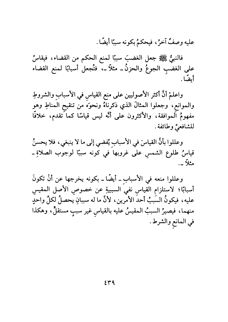 وعللوا بأنَّ القياسَ في الأسباب يُفضي إلى ما لا ينبغي، فلا يحسنُ قياسُ طلوع الشمسِ على غروبها في كونه سببًا لوجوب الصلاةِ -مثلًا-.