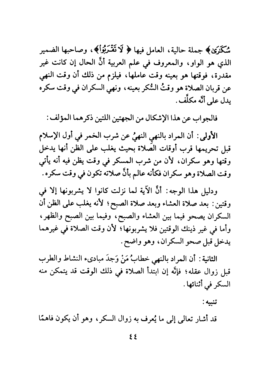 سُكَارَى} جملة حالية، العامل فيها {لَا تَقْرَبُوا}، وصاحبها الضمير الذي هو الواو، والمعروف في علم العربية أنَّ الحال إن كانت غير مقدرة، فوقتها هو بعينه وقت عاملها، فيلزم من ذلك أن وقت النهي عن قربان الصلاة هو وقتُ السُّكر بعينه، ونهي السكران في وقت سكره يدل على أنَّه مكلَّف.