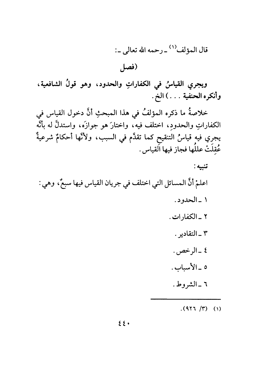 خلاصةُ ما ذكره المؤلفُ في هذا المبحثِ أنَّ دخول القياس في الكفاراتِ والحدودِ، اختلف فيه، واختارَ هو جوازَه، واستدلَّ له بأنَّه يجري فيه قياسُ التنقيحِ كما تقدَّم في السبب، ولأنَّها أحكامٌ شرعيةٌ عُقِلَتْ عللُها فجاز فيها القياس.