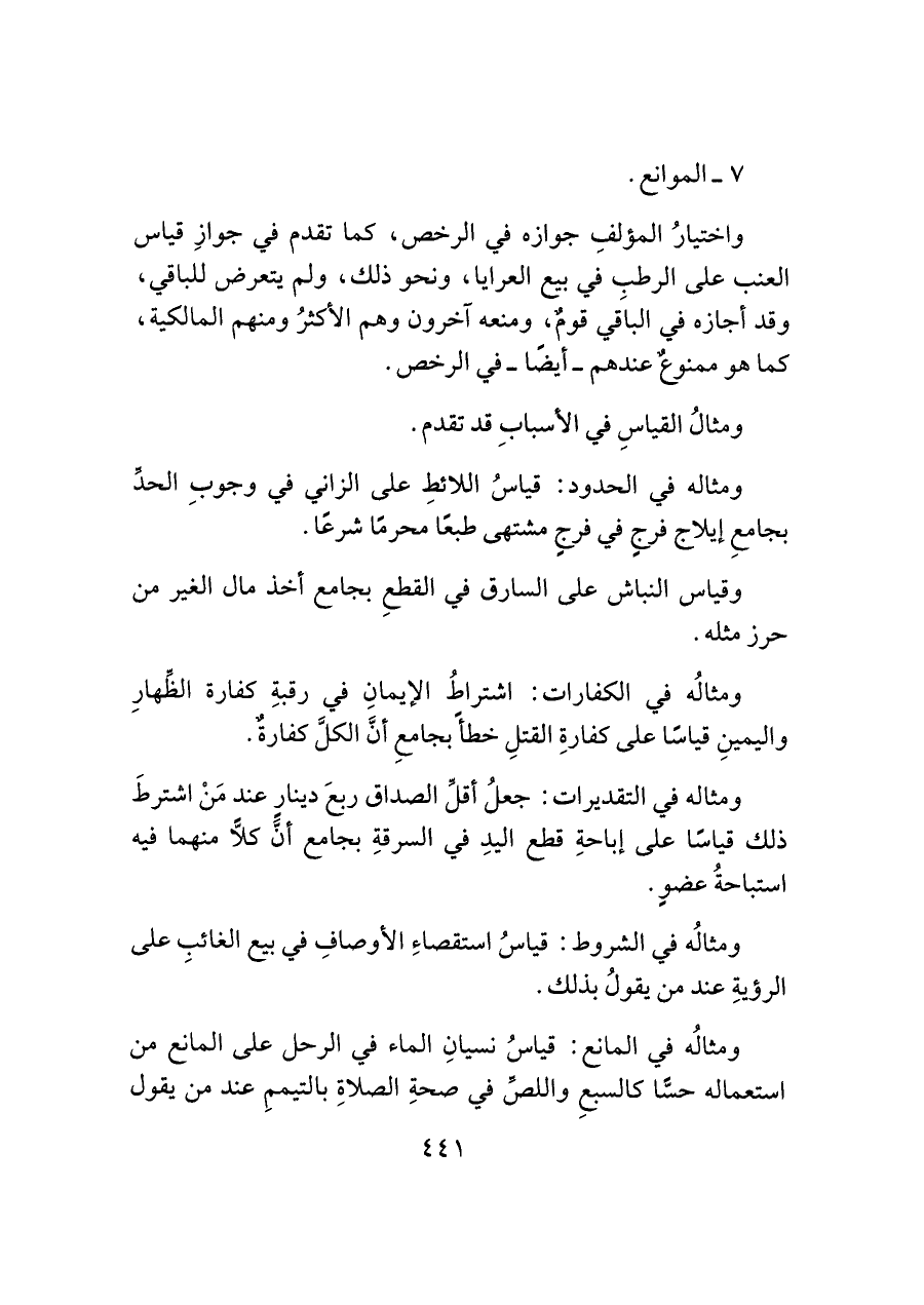 واختيارُ المؤلفِ جوازه في الرخص، كما تقدم في جوازِ قياس العنب على الرطب في بيع العرايا، ونحو ذلك، ولم يتعرض للباقي، وقد أجازه في الباقي قومٌ، ومنعه آخرون وهم الأكثرُ ومنهم المالكية، كما هو ممنوعٌ عندهم -أيضًا- في الرخص.