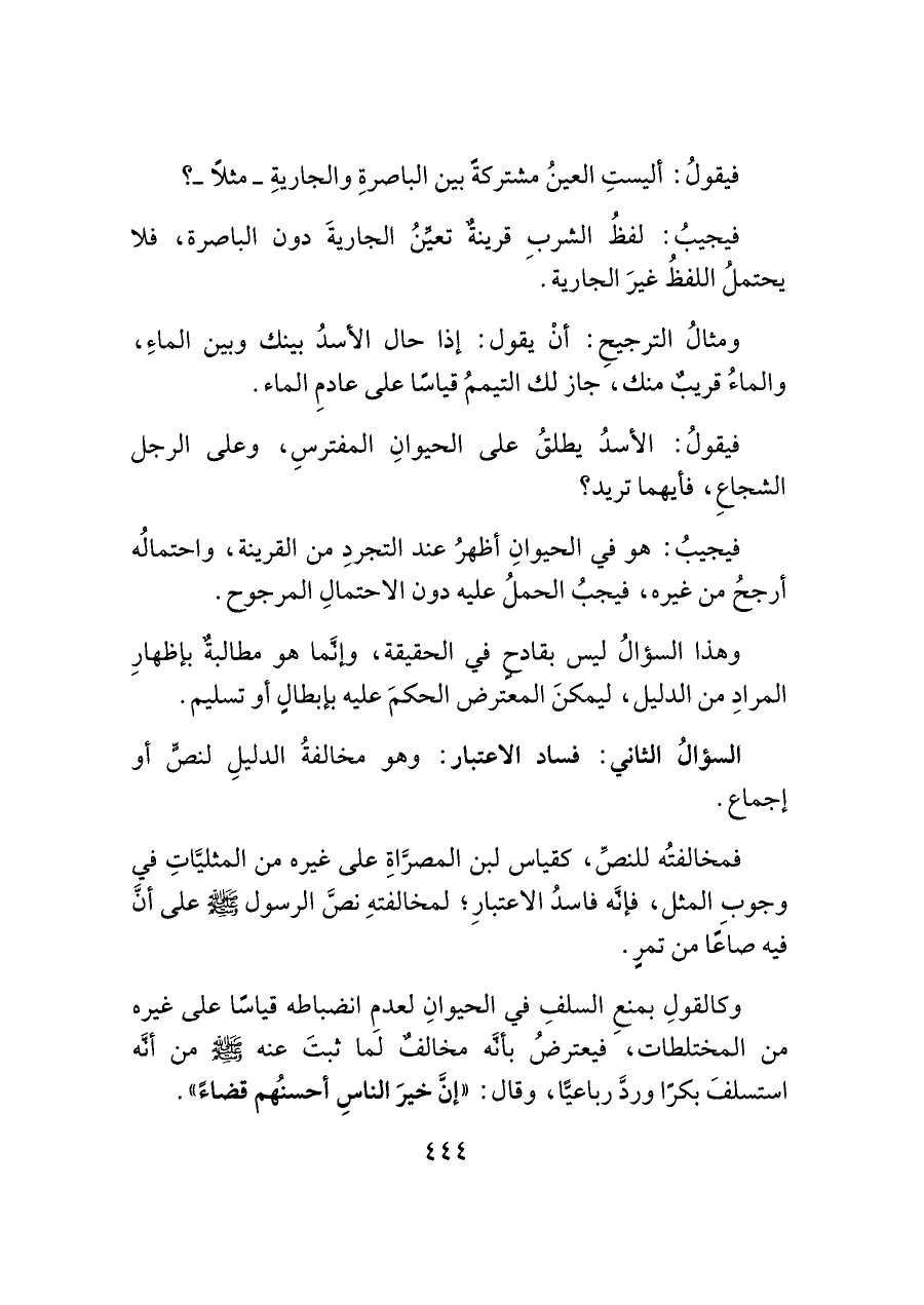 وكالقولِ بمنعِ السلفِ في الحيوانِ لعدمِ انضباطه قياسًا على غيره من المختلطات، فيعترضُ بأنَّه مخالفٌ لما ثبتَ عنه -صلى اللَّه عليه وسلم- من أنَّه استسلفَ بكرًا وردَّ رباعيًّا، وقال: "إنَّ خيرَ الناسِ أحسنُهم قضاءً".