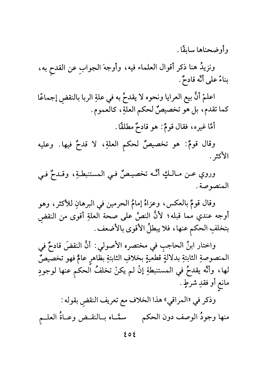 واختار ابنُ الحاجبِ في مختصره الأصولي: أنَّ النقضَ قادحٌ في المنصوصةِ الثابتةِ بدلالةٍ قطعيةٍ بخلافِ الثابتةِ بظاهرٍ عامٍّ فهو تخصيصٌ لها، وأنَّه يقدحُ في المستنبطةِ إنْ لم يكنْ تخلفُ الحكمِ عنها لوجودِ مانعٍ أو فقدِ شرطٍ.