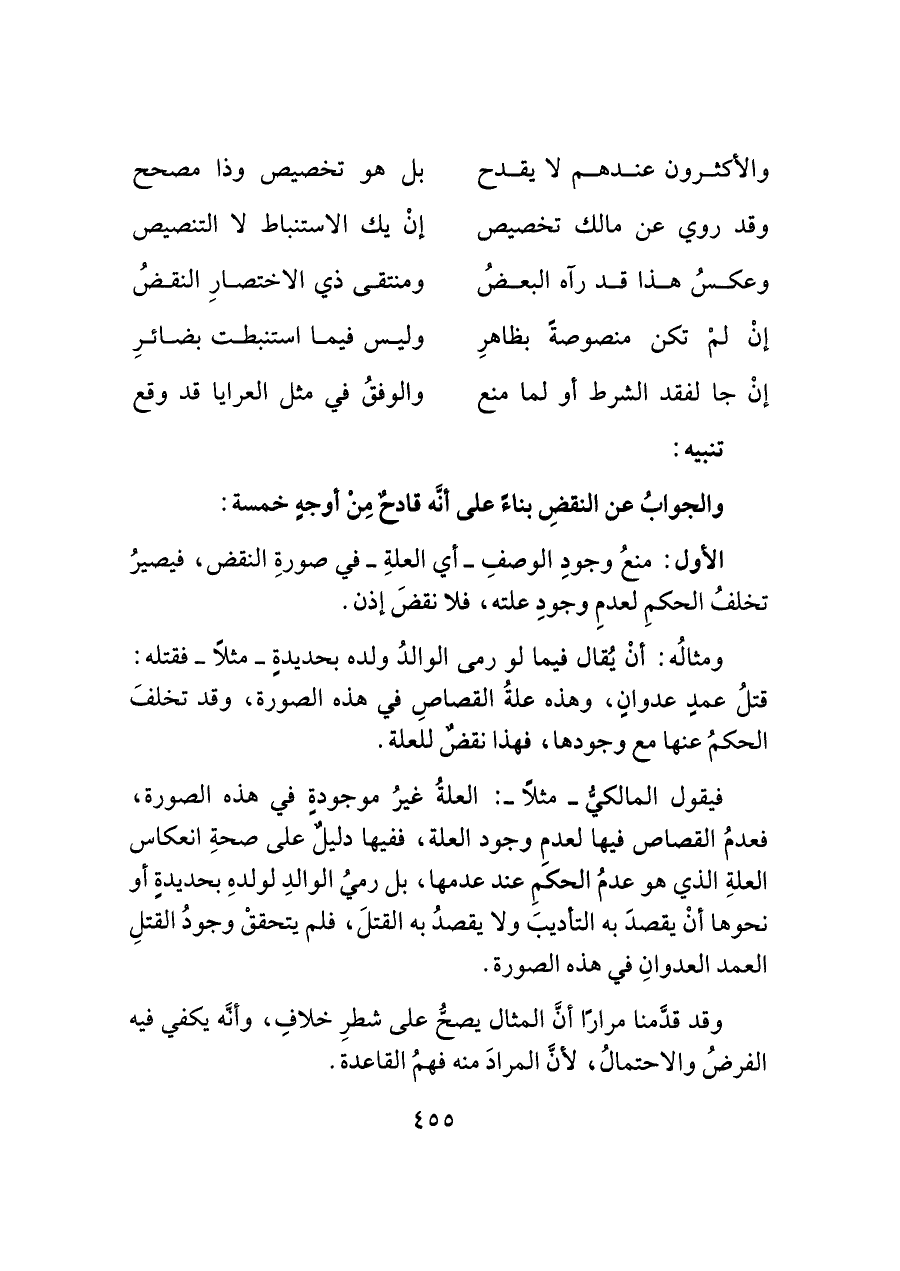 والجوابُ عن النقضِ بناءً على أنَّه قادحٌ مِنْ أوجهٍ خمسة: