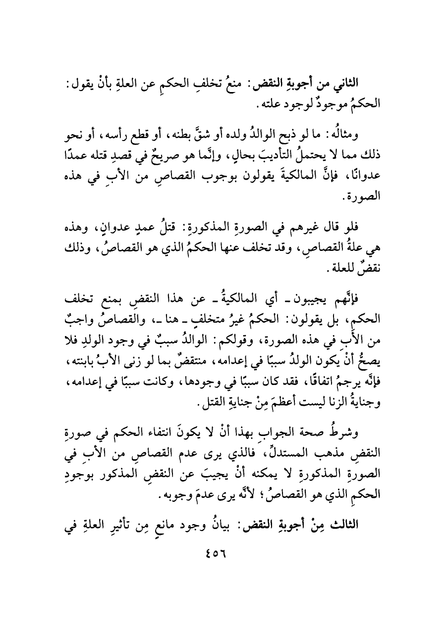 فإنَّهم يجيبون -أي المالكيةُ- عن هذا النقضِ بمنع تخلف الحكمِ، بل يقولون: الحكمُ غيرُ متخلفٍ -هنا-، والقصاصُ واجبٌ من الأَبِ في هذه الصورة، وقولكم: الوالدُ سببٌ في وجود الولدِ فلا يصحُّ أنْ يكون الولدُ سببًا في إعدامه، منتقضٌ بما لو زنى الأبُ بابنته، فإنَّه يرجمُ اتفاقًا، فقد كان سببًا في وجودها، وكانت سببًا في إعدامه، وجنايةُ الزنا ليست أعظمَ مِنْ جنايةِ القتل.