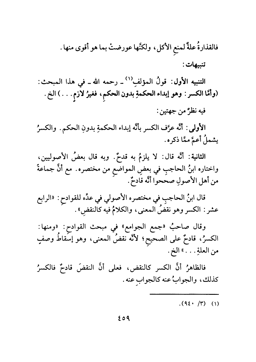 قال ابنُ الحاجب في مختصره الأصولي في عدِّه للقوادحِ: "الرابع عشر: الكسر وهو نقضُ المعنى، والكلامُ فيه كالنقضِ".