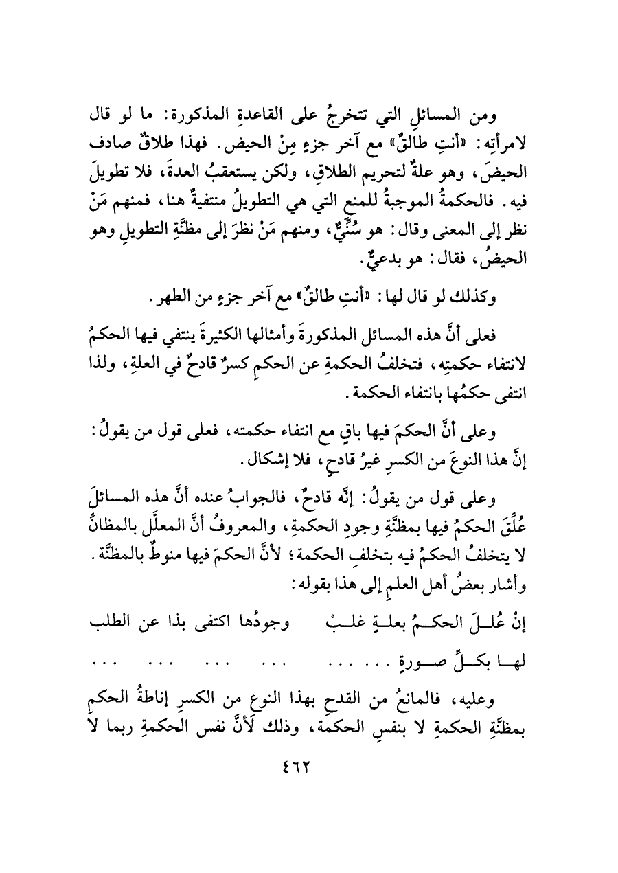 ومن المسائلِ التي تتخرجُ على القاعدةِ المذكورة: ما لو قال لامرأتِه: "أنتِ طالقٌ" مع آخر جزءٍ مِنْ الحيض. فهذا طلاقٌ صادف الحيضَ، وهو علةٌ لتحريم الطلاقِ، ولكن يستعقبُ العدةَ، فلا تطويلَ فيه. فالحكمةُ الموجبةُ للمنع التي هي التطويلُ منتفيةٌ هنا، فمنهم مَنْ نظر إلى المعنى وقال: هو سُنِّيٌّ، ومنهم مَنْ نظرَ إلى مظنَّةِ التطويلِ وهو الحيضُ، فقال: هو بدعيٌّ.