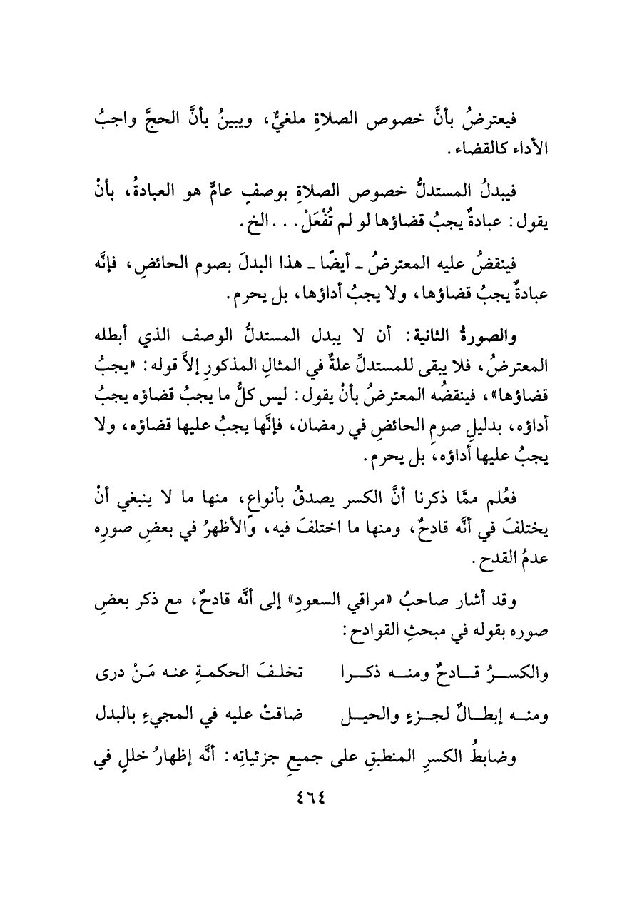 والصورةُ الثانية: أن لا يبدل المستدلُّ الوصف الذي أبطله المعترضُ، فلا يبقى للمستدلِّ علةٌ في المثالِ المذكورِ إلَّا قوله: "يجبُ قضاؤها"، فينقضُه المعترضُ بأنْ يقول: ليس كلُّ ما يجبُ قضاؤه يجبُ أداؤه، بدليلِ صومِ الحائضِ في رمضان، فإنَّها يجبُ عليها قضاؤه، ولا يجبُ عليها أداؤه، بل يحرم.
