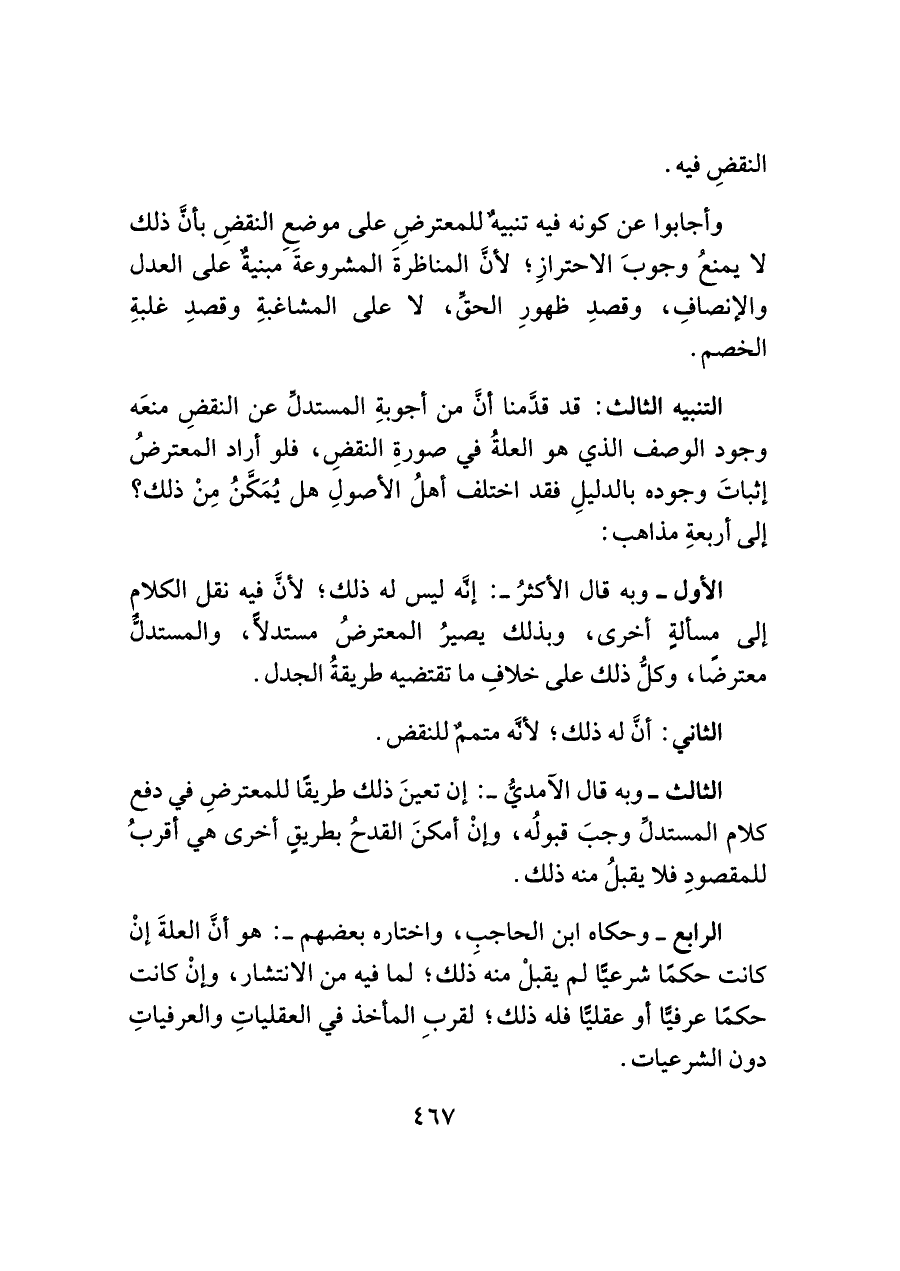 وأجابوا عن كونه فيه تنبيهٌ للمعترضِ على موضعِ النقضِ بأنَّ ذلك لا يمنعُ وجوبَ الاحترازِ؛ لأنَّ المناظرةَ المشروعةَ مبنيةٌ على العدل والإنصافِ، وقصدِ ظهورِ الحقِّ، لا على المشاغبةِ وقصدِ غلبةِ الخصم.