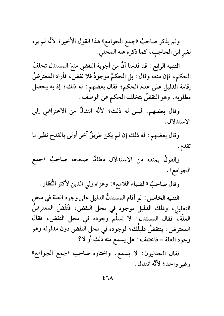 التنبيه الخامس: لو أقام المستدلُّ الدليل على وجود العلة في محل التعليلِ، وذلك الدليل موجود في محل النقض، فنَقَضَ المعترضُ العلَة، فقال المستدل: لا نسلِّم وجوده في محل النقض، فقال المعترض: ينتقضُ دليلُك؛ لوجوده في محل النقض دون مدلوله وهو وجود العلة = فاختلف: هل يسمع منه ذلك أو لا؟