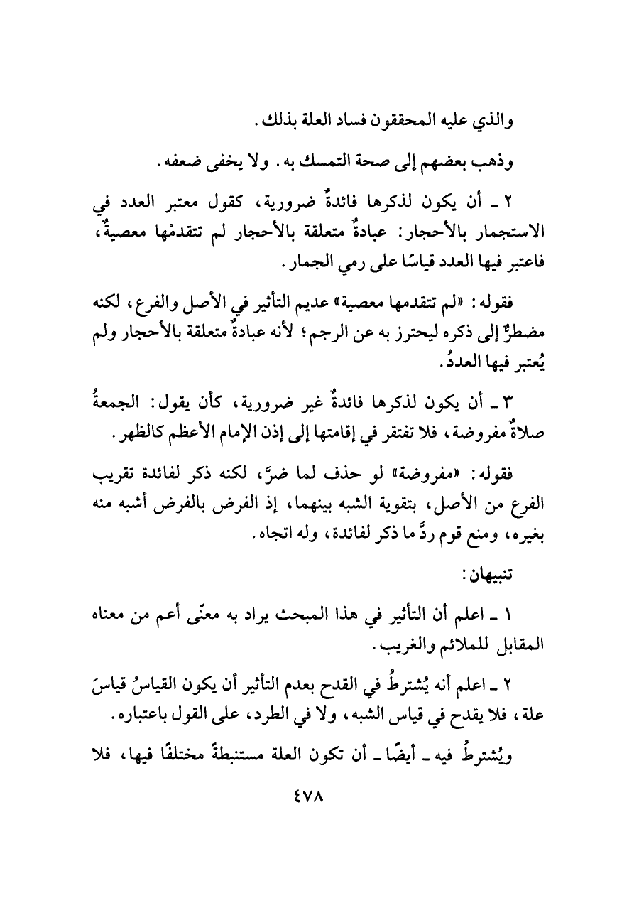 ٢ - أن يكون لذكرها فائدةٌ ضرورية، كقول معتبر العدد في الاستجمار بالأحجار: عبادةٌ متعلقة بالأحجار لم تتقدمْها معصيةٌ، فاعتبر فيها العدد قياسًا على رمي الجمار.