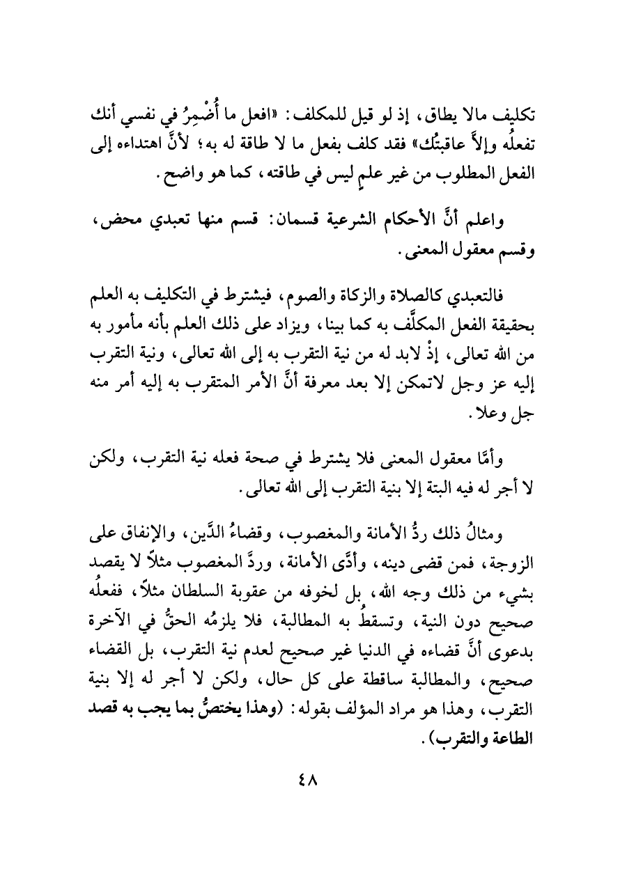 ومثالُ ذلك ردُّ الأمانة والمغصوب، وقضاءُ الدَّين، والإنفاق على الزوجة، فمن قضى دينه، وأدَّى الأمانة، وردَّ المغصوب مثلًا لا يقصد بشيء من ذلك وجه اللَّه، بل لخوفه من عقوبة السلطان مثلًا، ففعلُه صحيح دون النية، وتسقطُ به المطالبة، فلا يلزمُه الحقُّ في الآخرة بدعوى أنَّ قضاءه في الدنيا غير صحيح لعدم نية التقرب، بل القضاء صحيح، والمطالبة ساقطة على كل حال، ولكن لا أجر له إلا بنية التقرب، وهذا هو مراد المؤلف بقوله: (وهذا يختصُّ بما يجب به قصد الطاعة والتقرب).
